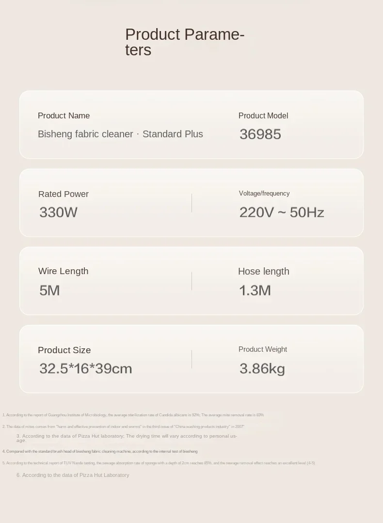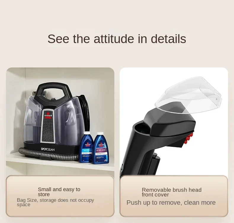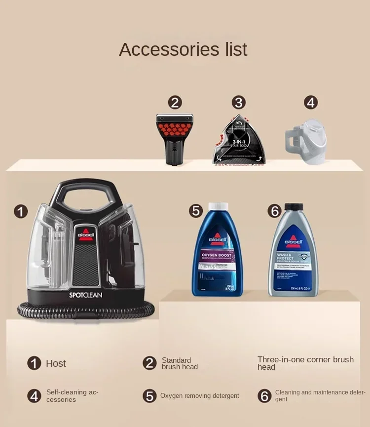 Power (W) : 330W Brand Name : Esyhey Origin : Mainland China brand : BISSELL Model : 36985 function : Dual use wet and dry Color classification : Light gray additional function : In addition to mites Special suction nozzle type : Integrated brush power : 330W Clear water tank capacity : 725ML Maximum noise : 65dB Line length : 5M Weight (including battery) : 3.86kg Battery life : Plug in payment 3C certificate number : 2016010708921238 Applicable materials : Fabric materials available Sewage tank capacity : 1100ML Maximum suction power : 10250Pa Fabric cleaning machine type : Household cableBrand: BISSELL/ Win-Win model: 36985 function: wet and dry color classification: light gray additional function: special suction nozzle type for mite removal: integrated brush power: 330W clean water tank capacity: 725ML maximum noise: 65dB line length: 5M body weight (including battery): 3.86kg battery life: plug-in 3C certificate number: 2016010708929 Sewage tank capacity: 1100ML maximum suction power: 10250Pa Fabric cleaning machine type: household wiredDHL/FedEx/UPS is unable to send cleaning solution and the courier company refuses to accept liquid transportation. Please understand, thank you.Cleaning solution requires additional purchase!![]()