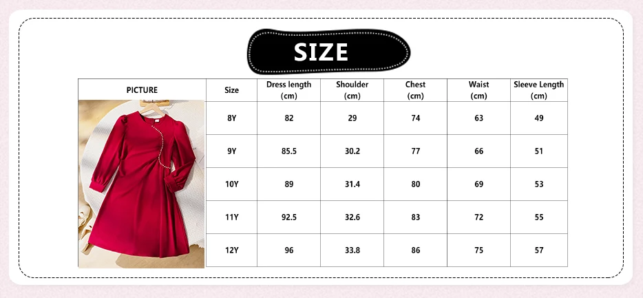 Size:12Y/Dress Length:96/Shoulder:33.8/Chest:86/Waist:75Sleeve Length:57