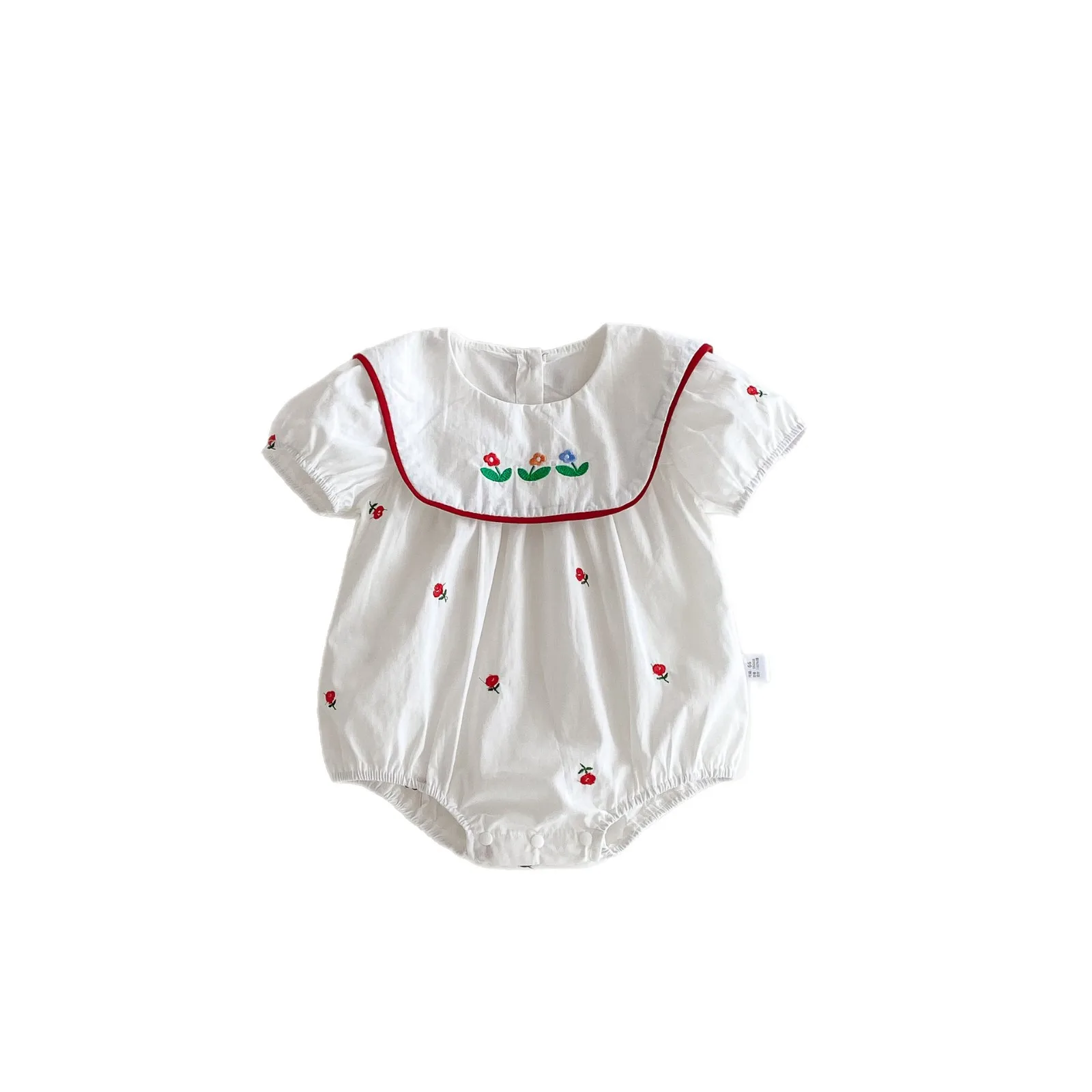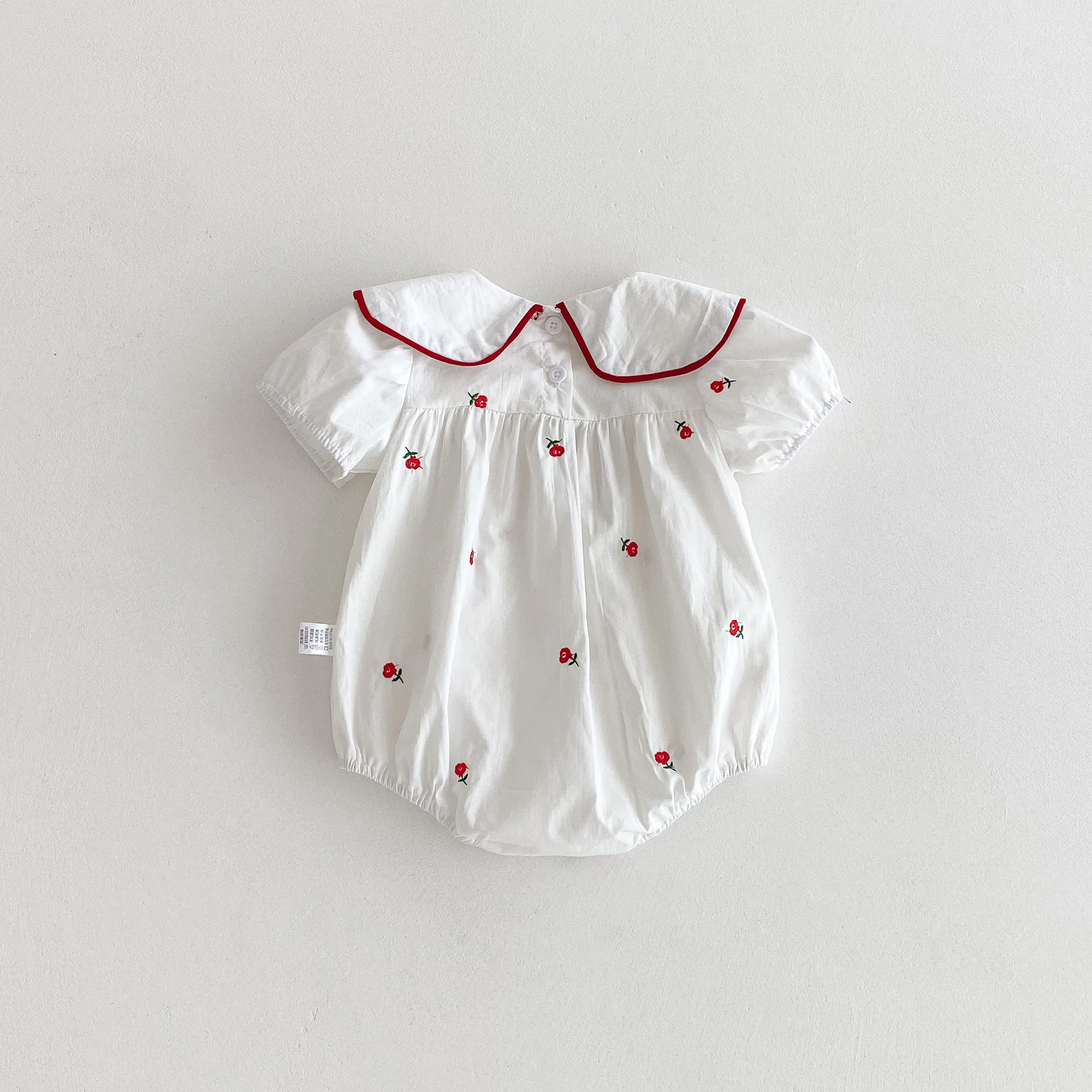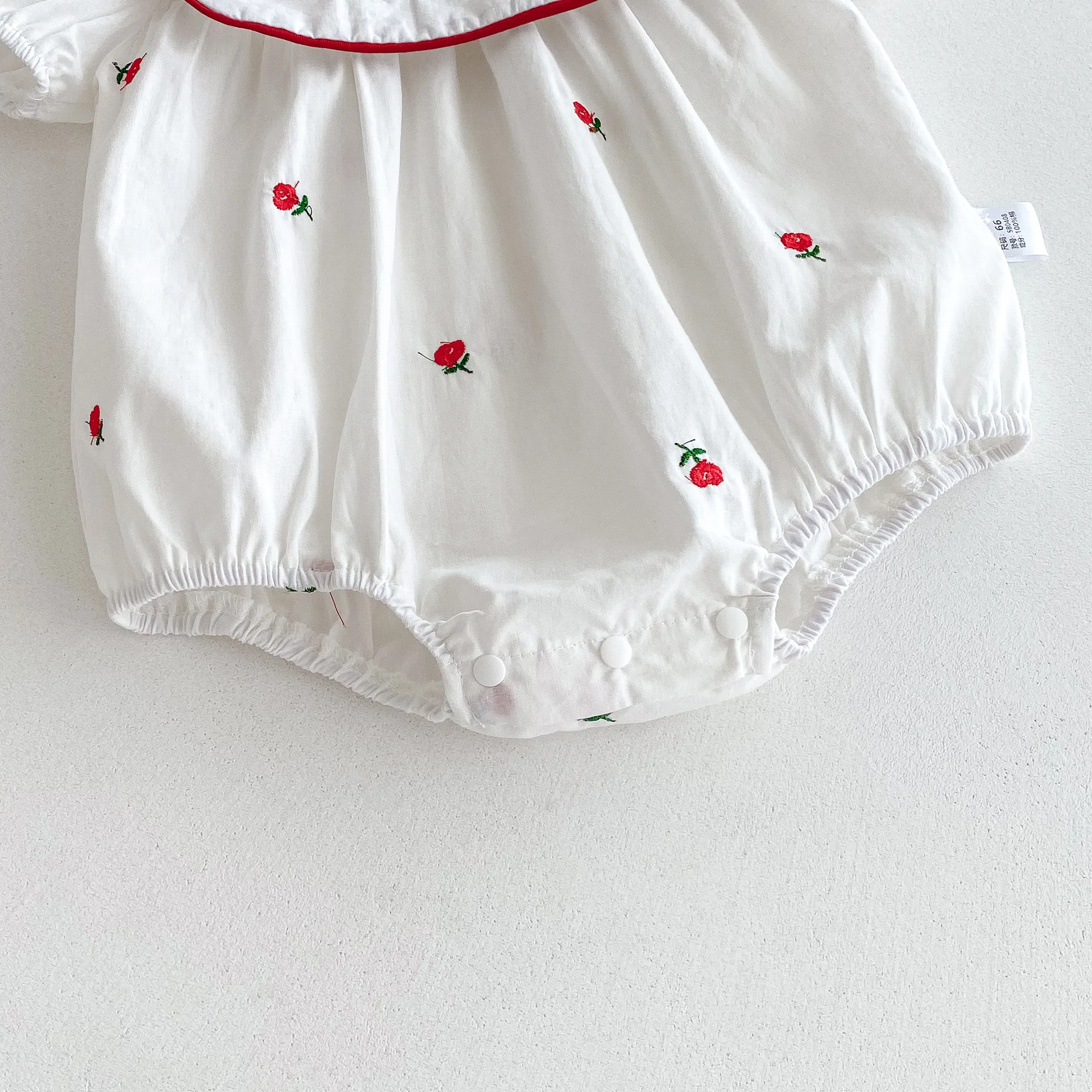 The romper features a square neckline with red trim for a classic touch, plus delicate embroidery (flowers and cherries) that adds sweet charm. The bubble short sleeves and snug onesie fit ensure freedom of movement—ideal for crawling, playing, or napping. A stylish pick for your little one!