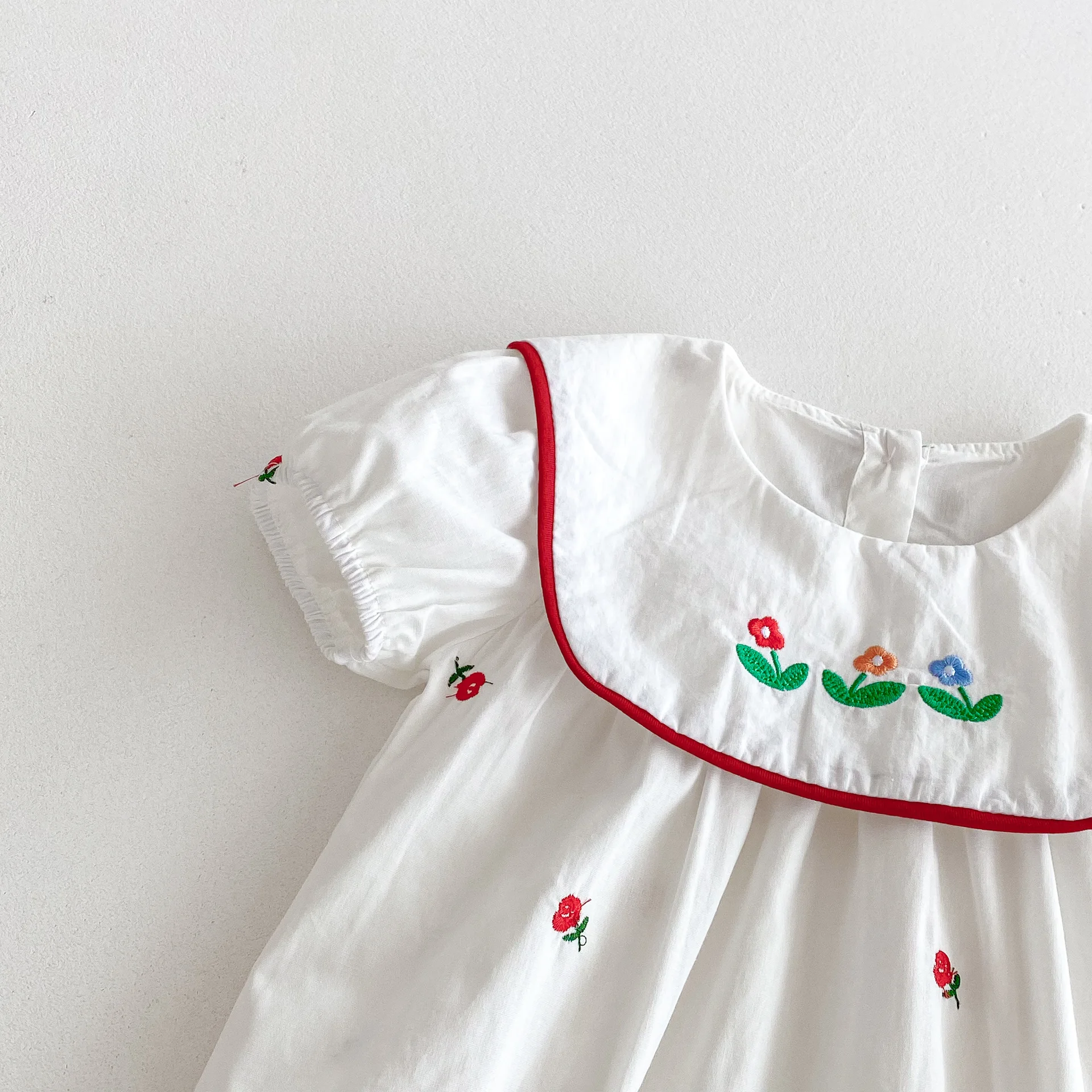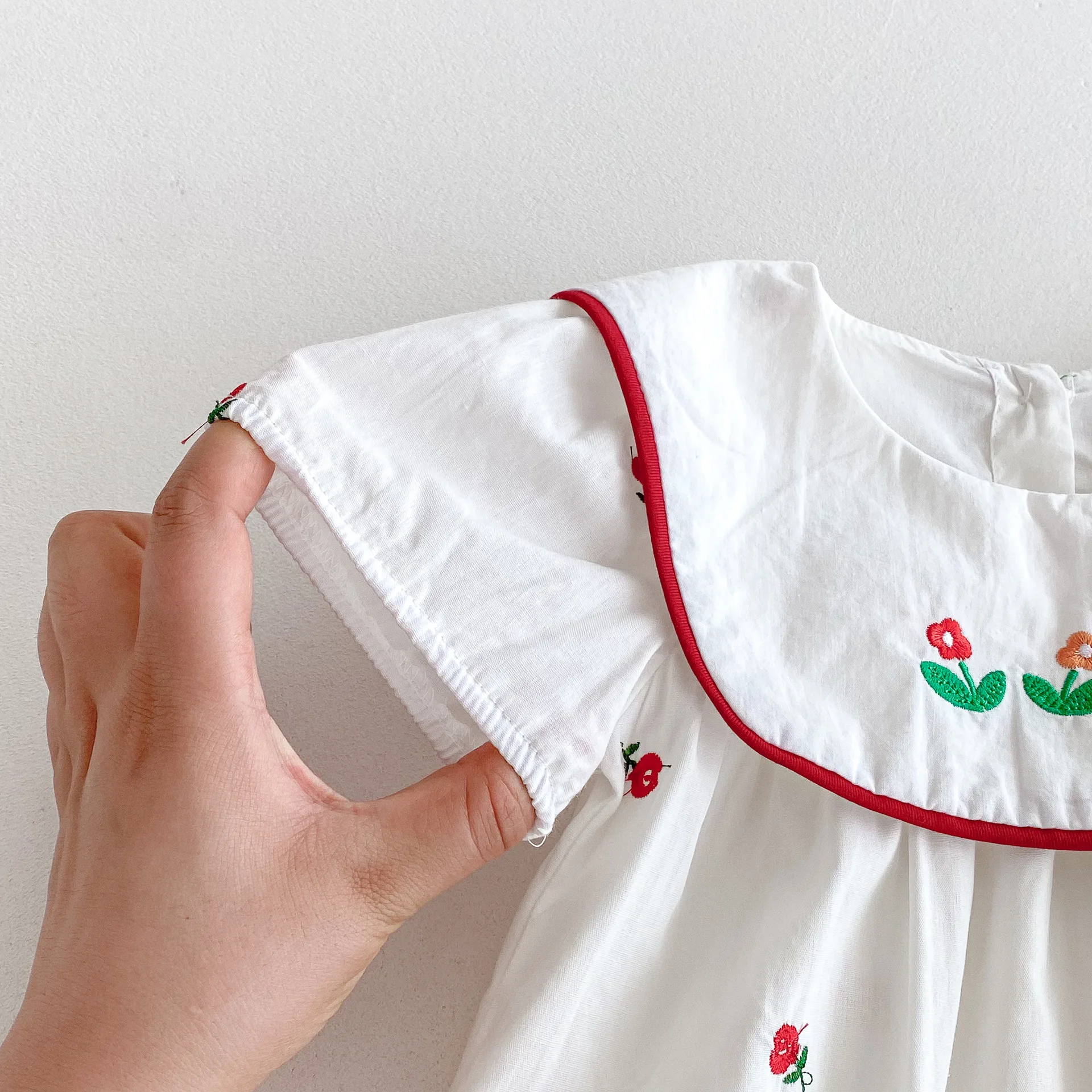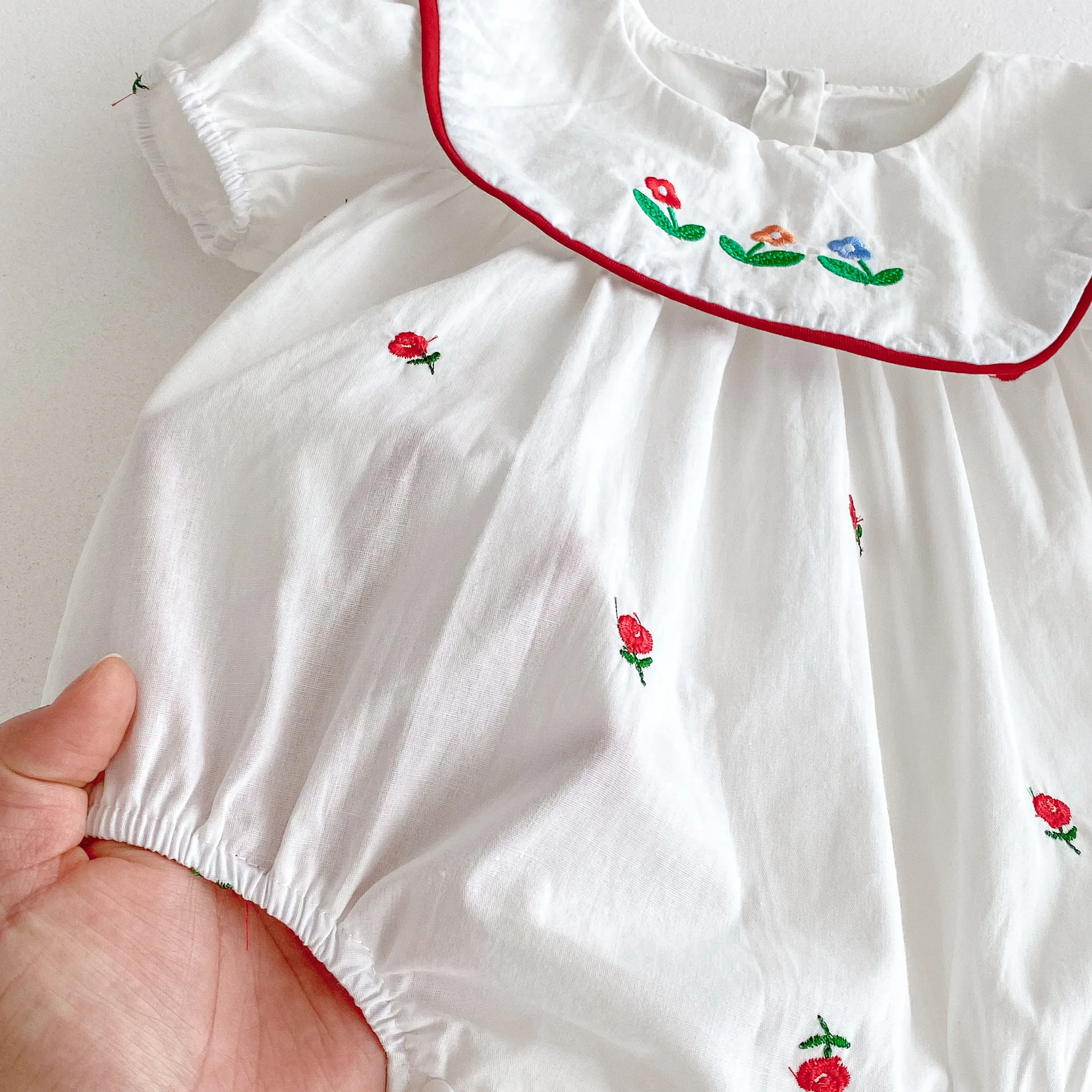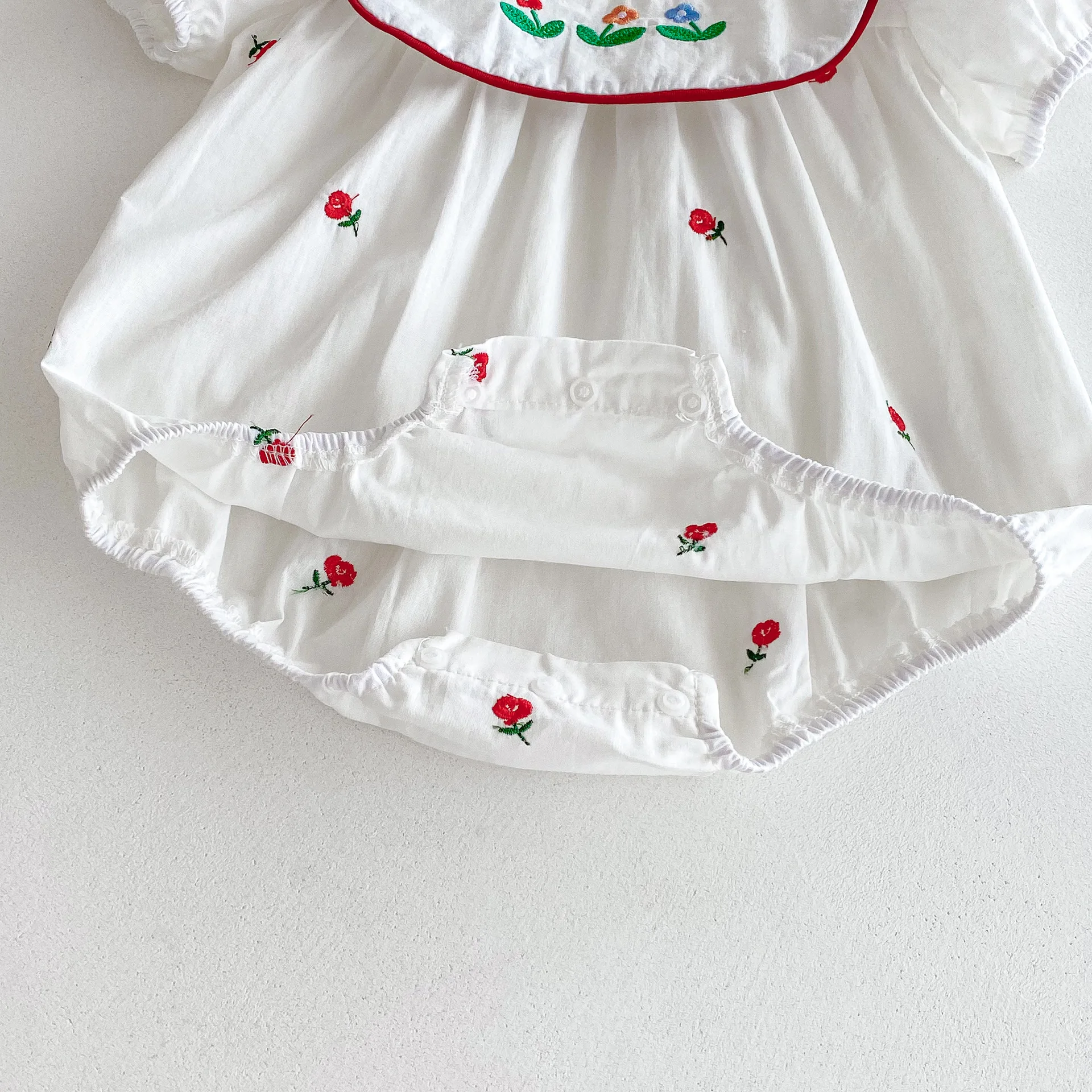 The romper features a square neckline with red trim for a classic touch, plus delicate embroidery (flowers and cherries) that adds sweet charm. The bubble short sleeves and snug onesie fit ensure freedom of movement—ideal for crawling, playing, or napping. A stylish pick for your little one!