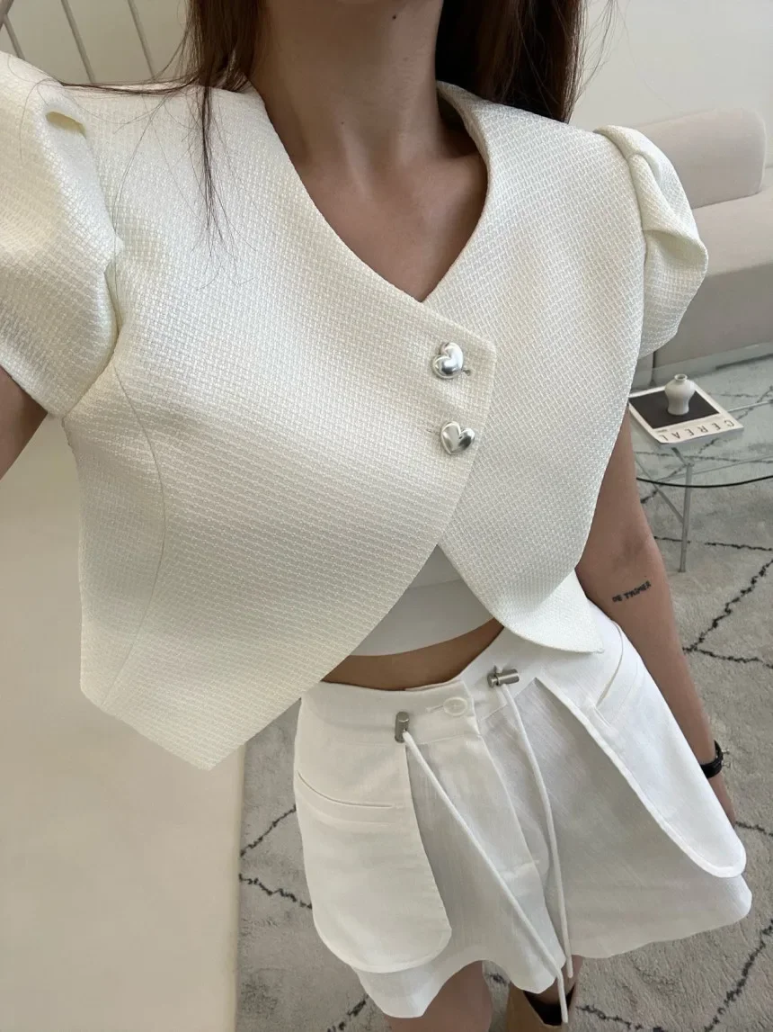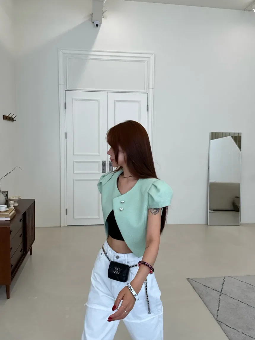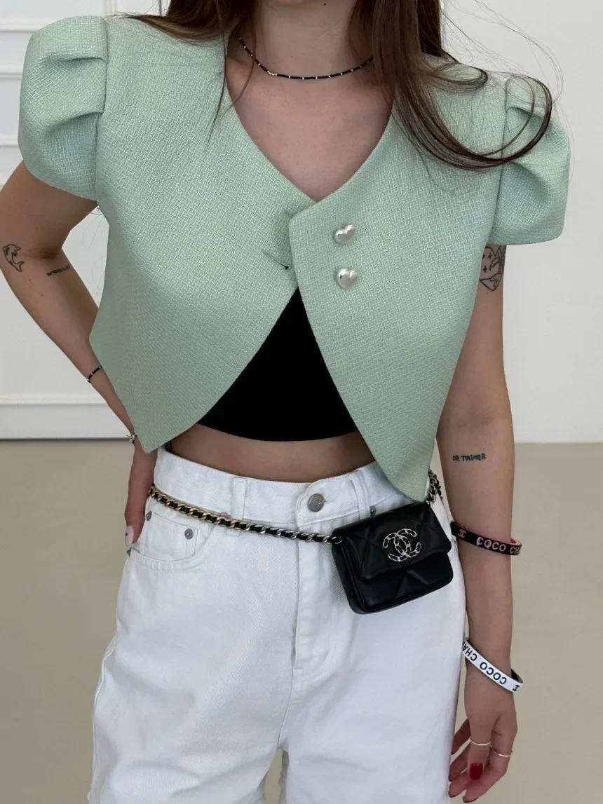 • Chic French Design :This women's short coat features a chic French design, making it a stylish addition to any wardrobe. Its heart-shaped button bubble sleeve adds a touch of whimsy and charm.