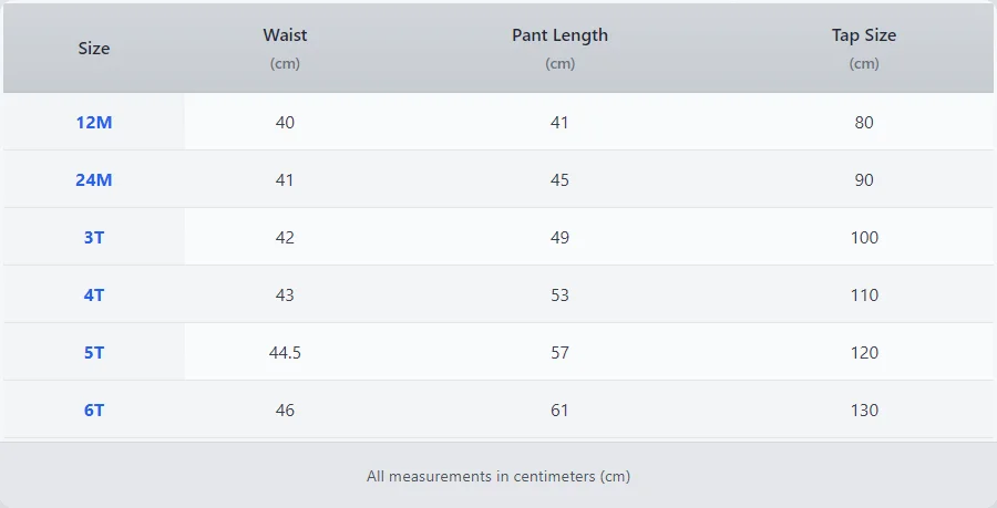 size_info: {"sizeInfoList":[{"length":{"cm":"40","inch":"15.75"},"size":"12M 80cm","vid":-35},{"length":{"cm":"41","inch":"16.14"},"size":"24M 90cm","vid":-36},{"length":{"cm":"42","inch":"16.54"},"size":"3T 100cm","vid":-37},{"length":{"cm":"43","inch":"16.93"},"size":"4T 110cm","vid":-38},{"length":{"cm":"44.5","inch":"17.52"},"size":"5T 120cm","vid":-39},{"length":{"cm":"46","inch":"18.11"},"size":"6T 130cm","vid":-40}]}