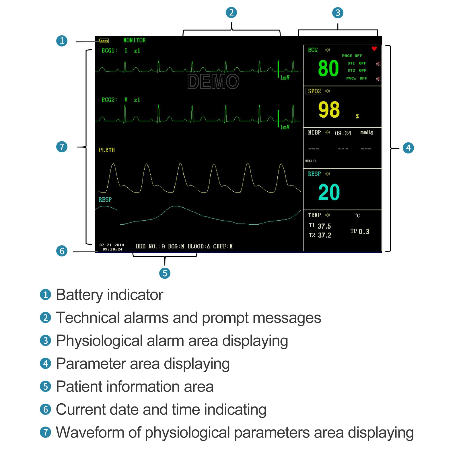 The monitor has abundant functions that can be used for clinical monitoring with adult, pediatric andneonate. Users may select different parameter configuration according to different requirements. Themonitor, power supplied by 100-240V~,50/60Hz, adopts 8'' color TFT LCD displaying real-time dateand waveform. It can synchronously display eight-channel waveform and full monitoring parametersequipped with an optional external 48mm thermal recorder. The monitor can be connected to thecentral monitoring system via wire or wireless network to form a network monitoring system.This device can monitor such parameters as ECG, RESP, SpO2, PR, NIBP and TEMP, etc. It integrates