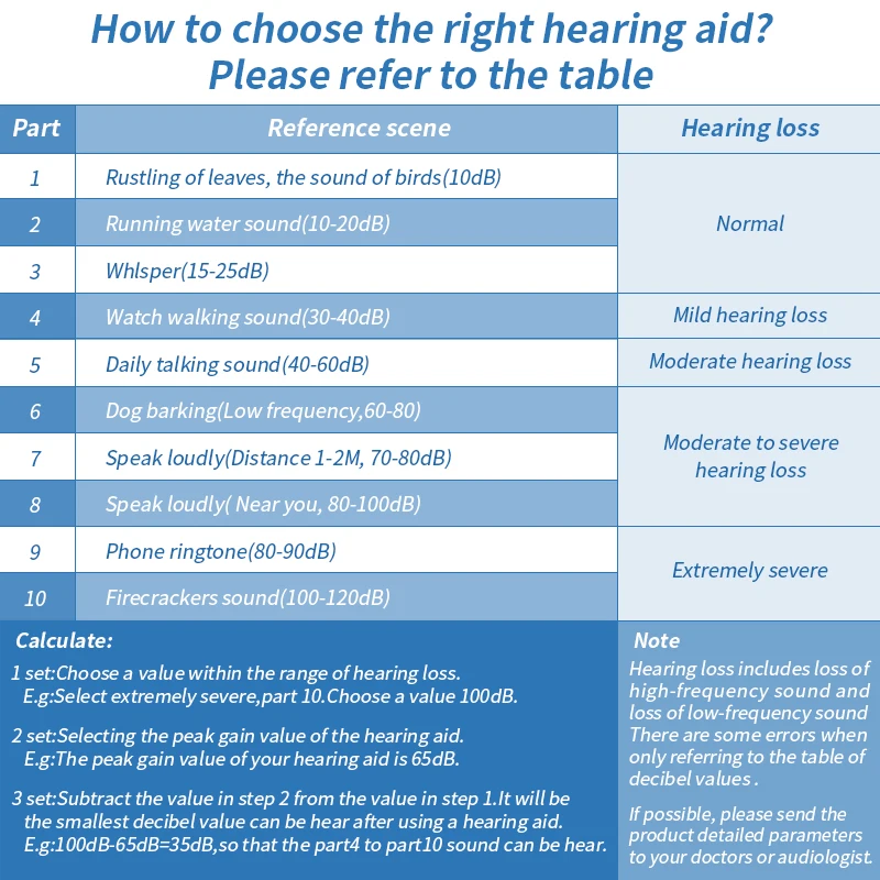 1. Peak Gain(dB): 35dB,Suitable for mild to moderate hearing loss (Reference hearing loss map)
