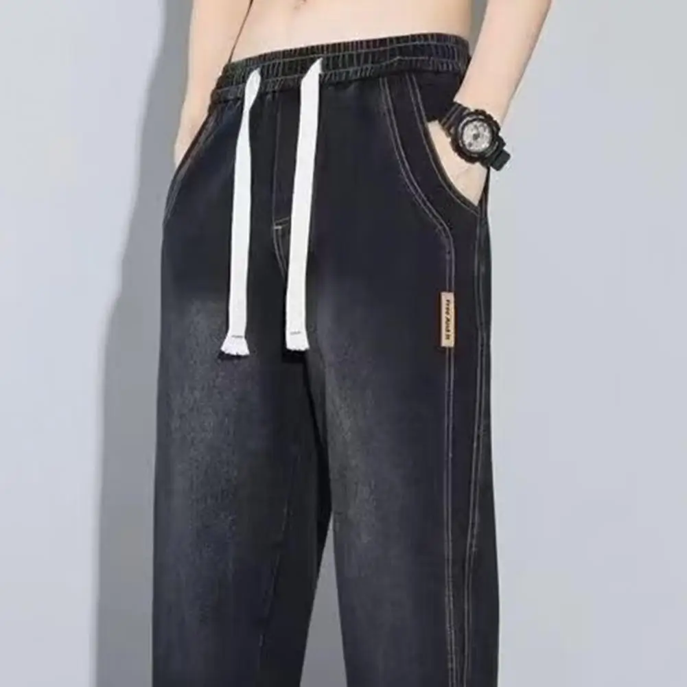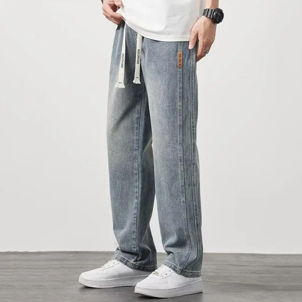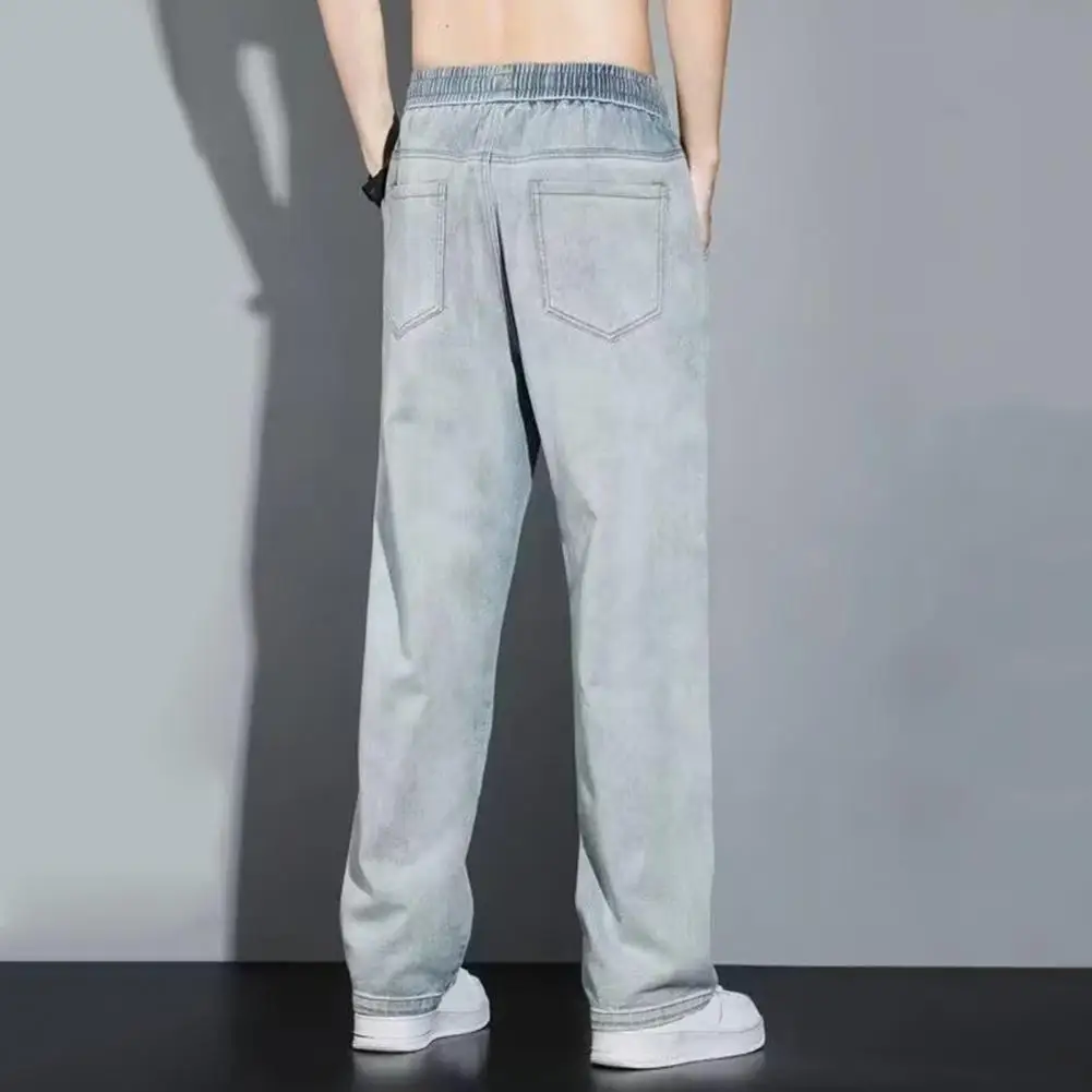 Drawstring Adjustment Denim Jeans Straight Wide Leg Casual Pants Men's Summer Jeans Elastic Waist Adjustable Drawstring Straight