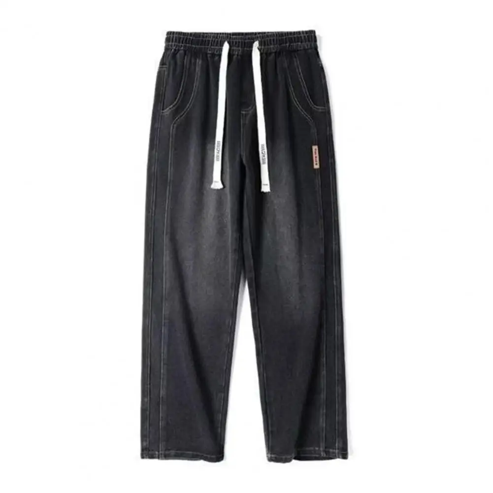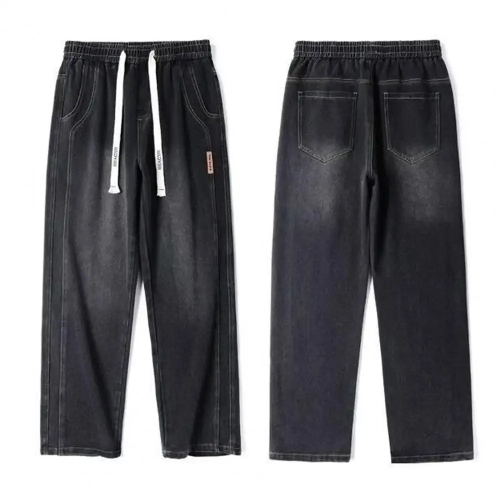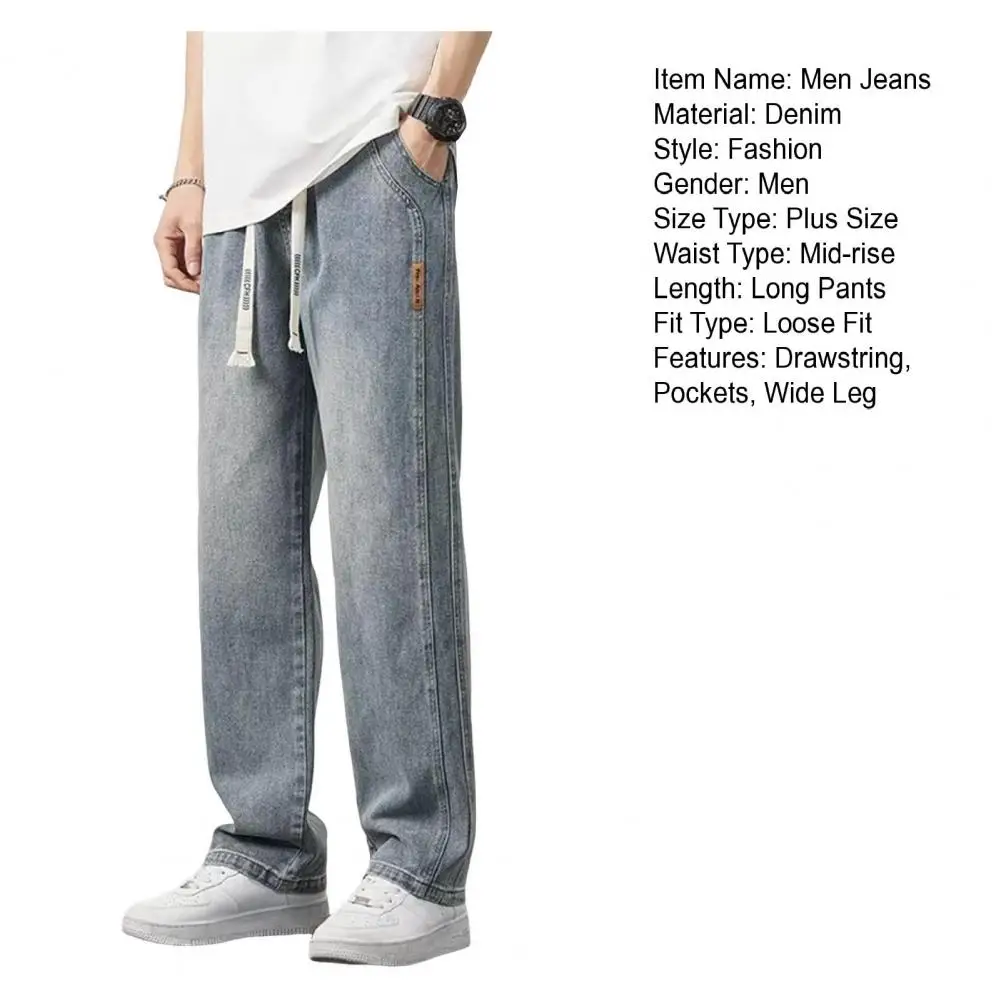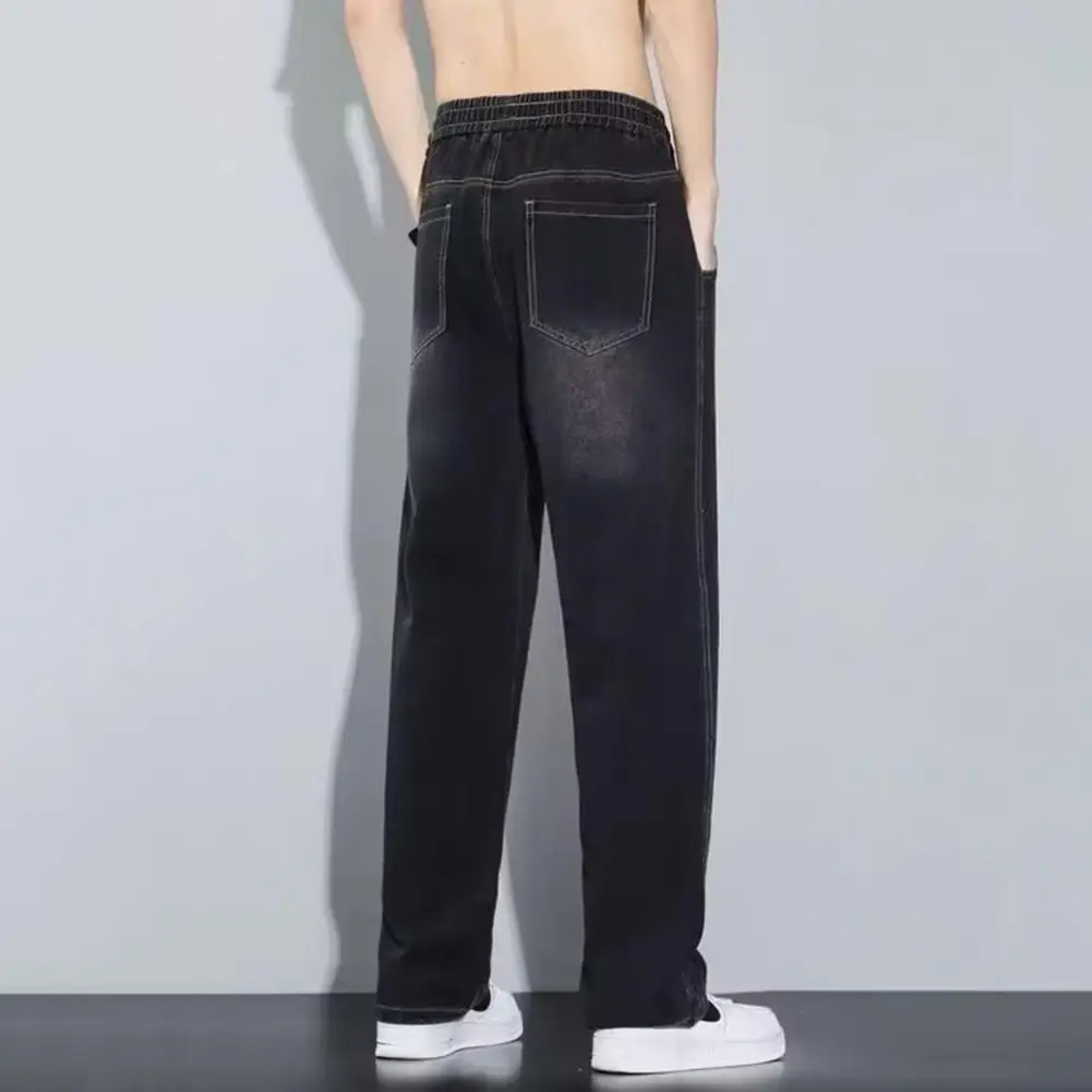 Drawstring Adjustment Denim Jeans Straight Wide Leg Casual Pants Men's Summer Jeans Elastic Waist Adjustable Drawstring Straight