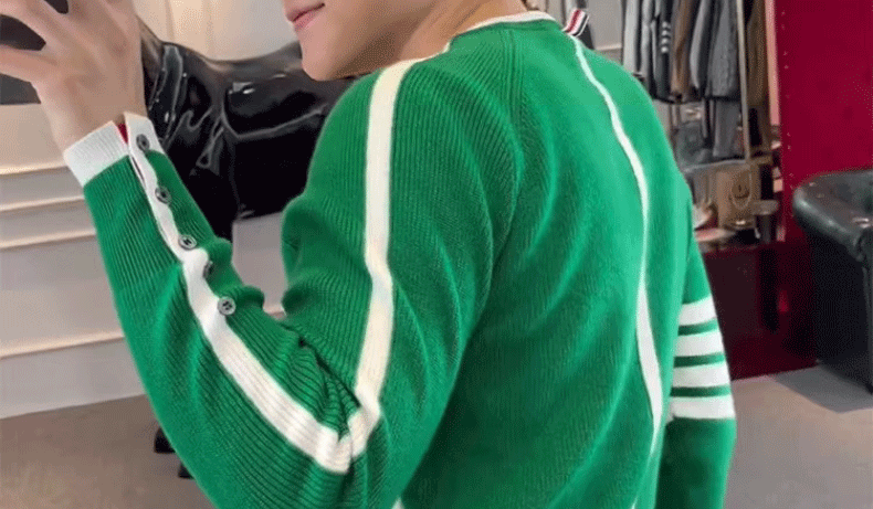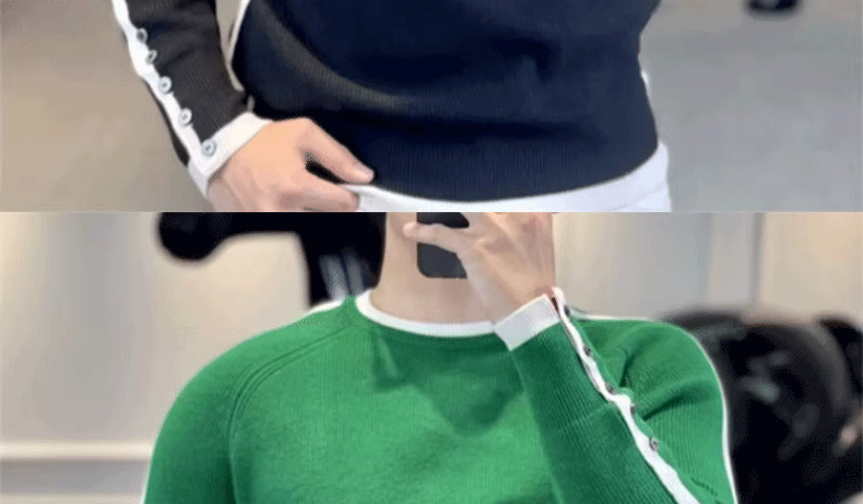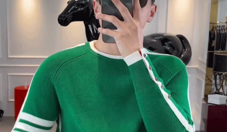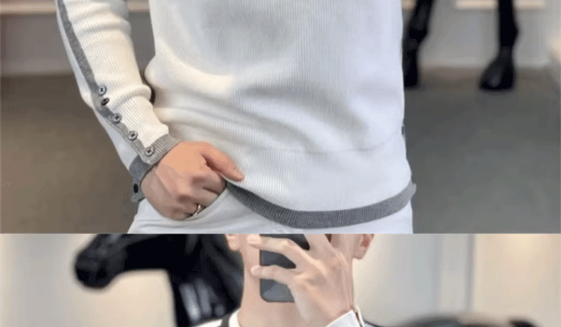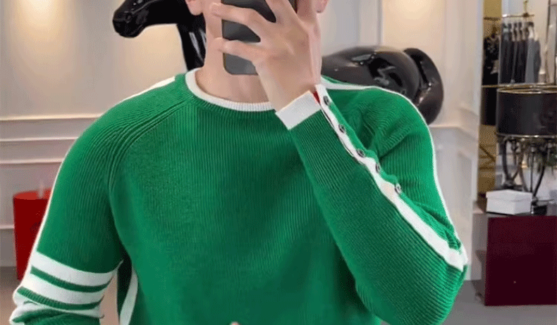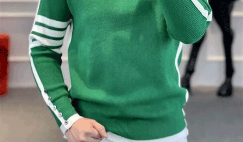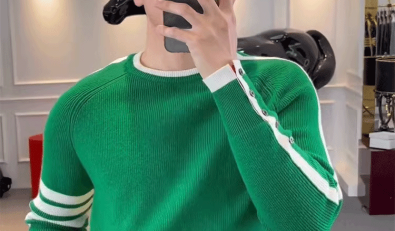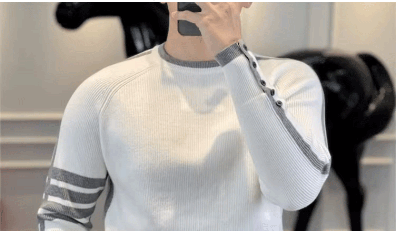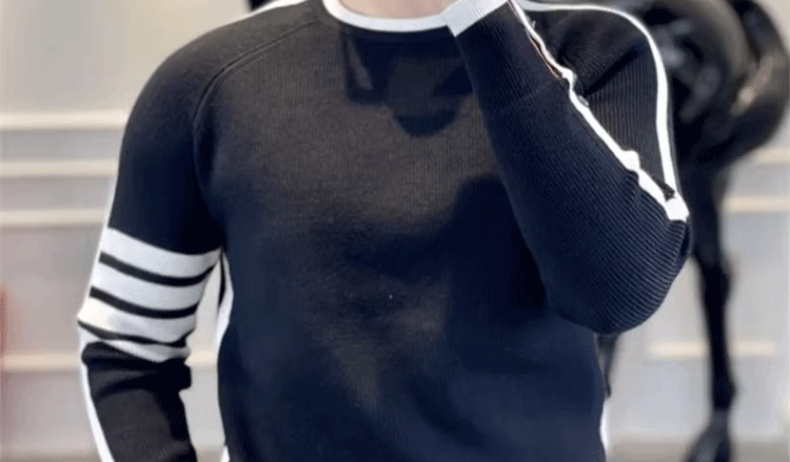 This men's knit sweater features a trendy striped pattern and a simple round neck design, perfect for urban fashion enthusiasts.