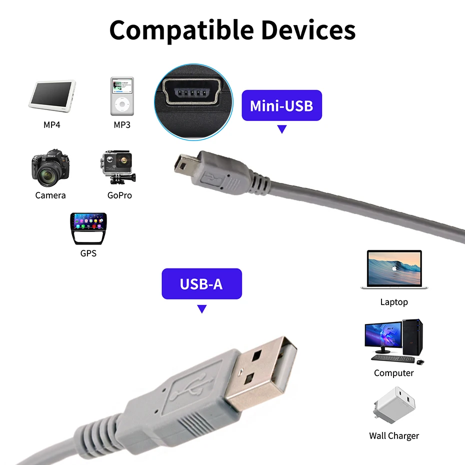 This USB 2.0 cable comes with USB 2.0 Type A connector and mini USB connector.It provides a high-quality replacement for the cable that came with your Mini USB mobile device. Or, you can keep it as a spare while traveling.The USB to mini usb cable is perfect for connecting devices such as your smartphone, GPS, digital camera, or portable hard drive, to your PC or Mac computer for everyday tasks such as charging, data synchronization or file transfers.