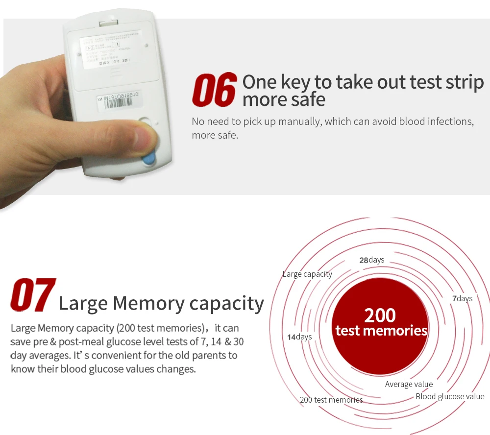 6, Large Memory capacity (200 test memories),it can save pre & post-meal glucose level tests of 7, 14, & 30 day averages.Reminder: