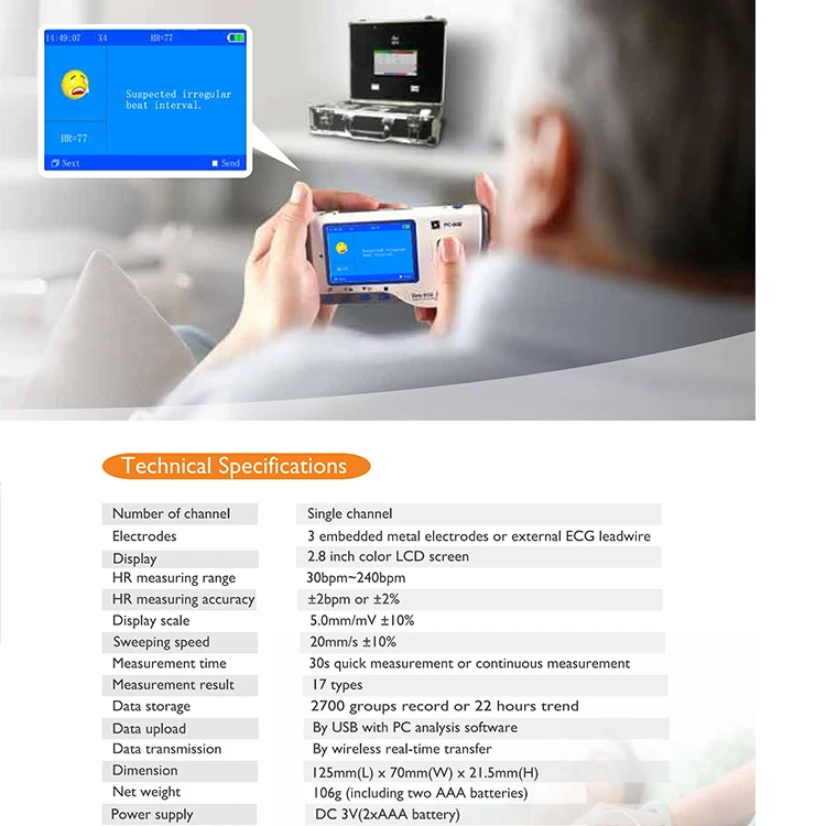 Viatom PC-80B ECG Monitor is intended for measuring and recording the ECG signals and average heart rate of adult patient. Advanced measuring technology provides steady and accurate ECG waveform. It is applicable for clinics and homes, and convenient to operate by the patients themselves. Also, can be used for continuous measuring with adhesive electrode pads and lead wire connected to the device.