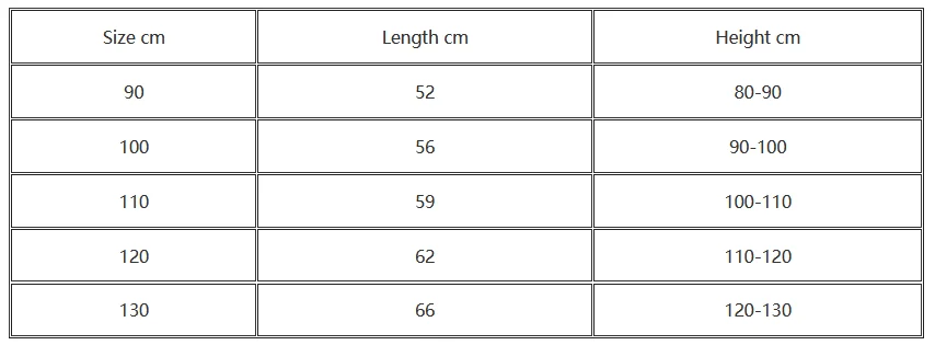 size_info: {"sizeInfoList":[{"length":{"cm":"50","inch":"19.69"},"size":"90cm 2-3Y","vid":-1},{"length":{"cm":"53","inch":"20.87"},"size":"100cm 3-4Y","vid":-2},{"length":{"cm":"57","inch":"22.44"},"size":"110cm 4-5Y","vid":-3},{"length":{"cm":"60","inch":"23.62"},"size":"120cm 5-6Y","vid":-4},{"length":{"cm":"63","inch":"24.80"},"size":"130cm 6-7","vid":-5}]}