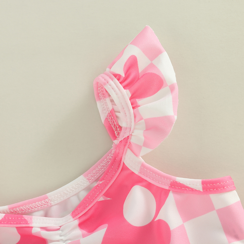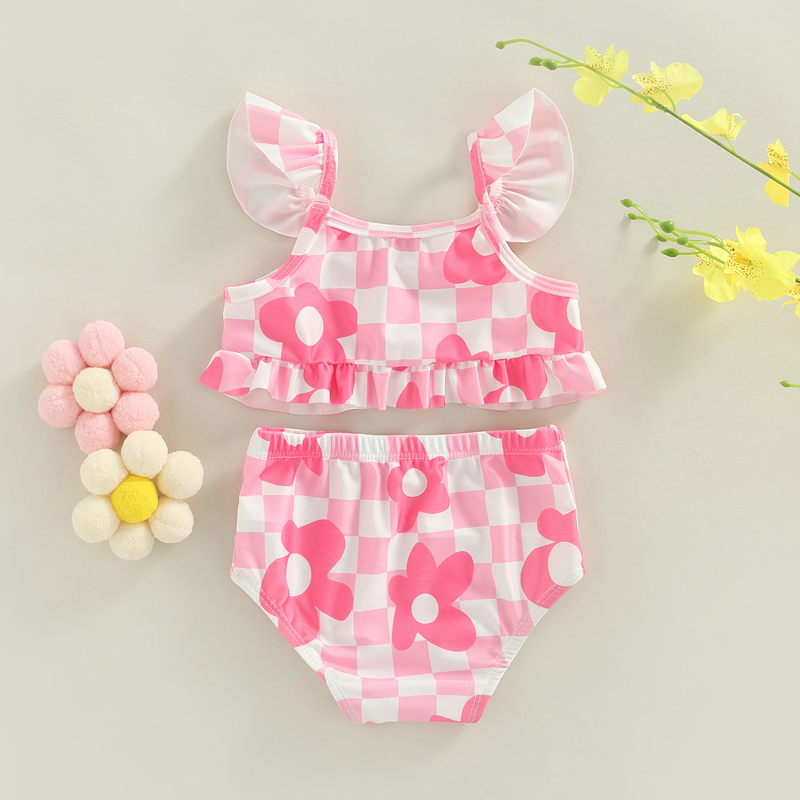 Baby Girls Bikini Set, Plaid Flower Print Fly Sleeve Camisole with Briefs Bathing Swimsuit for Summer Beach
