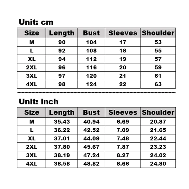 4XL:Lenth 98cm, Bust 124cm, sleeves 22cm, shoulders 63cm, suggest weight: 90-100KG.