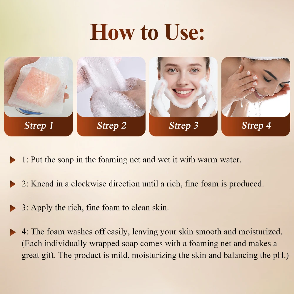 Step 4: The foam washes off easily, leaving your skin smooth and moisturized. (Each individually wrapped soap comes with a foaming net and makes a great gift. The product is mild, moisturizing the skin and balancing the pH.)