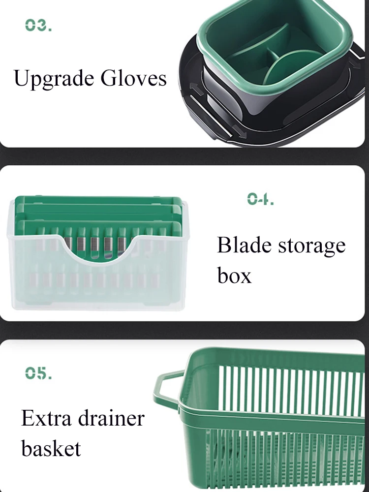 Material:ABS+304 stainless steel blade*7+Protective Gloves + Egg White Separator + Knife Storage Box + Drain Basket+Color Box+food container