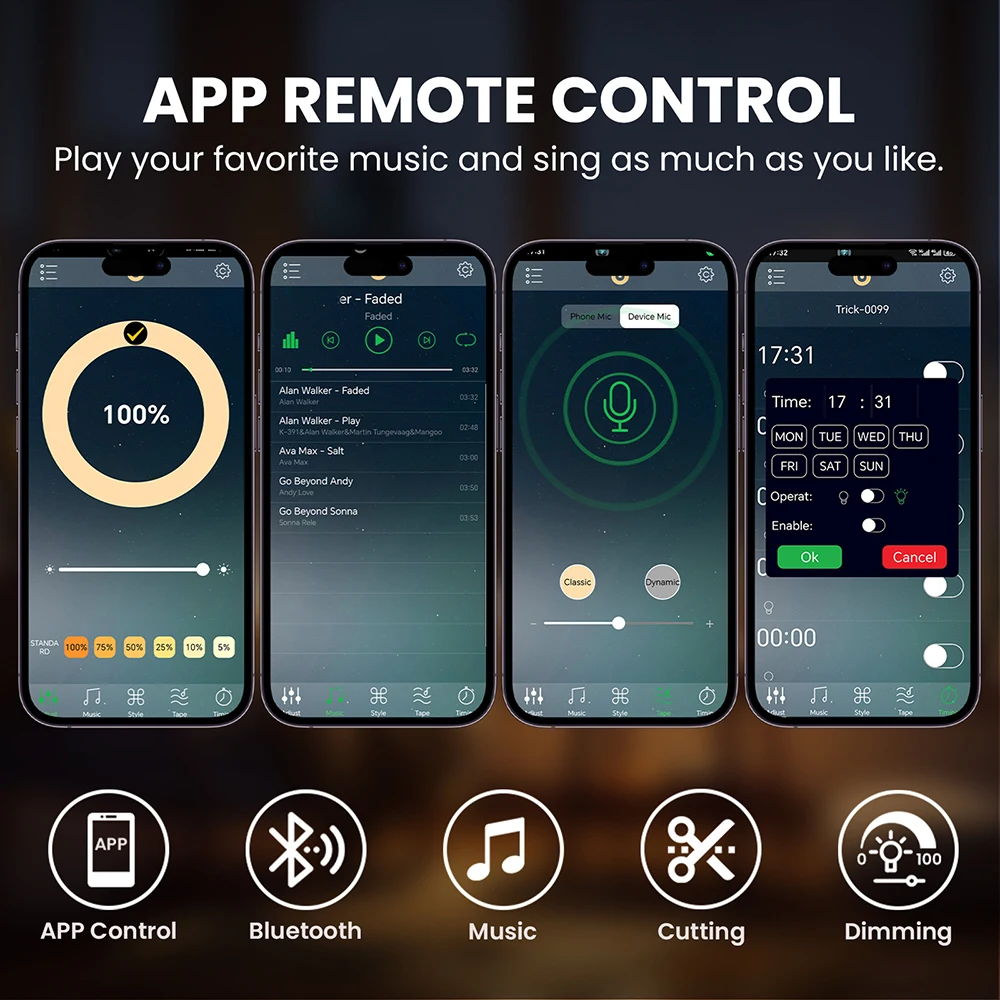 ①23-key remote control and mobile app for Bluetooth operation, enabling brightness and speed adjustments, delayed shutdown, and power-off memory.