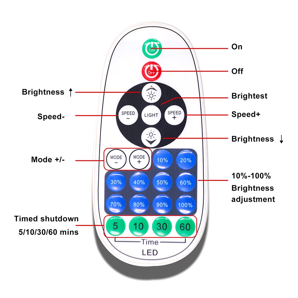 ①Brightness Adjustment: Stepless dimming for precise control.Speed Control: 10 adjustable levels.