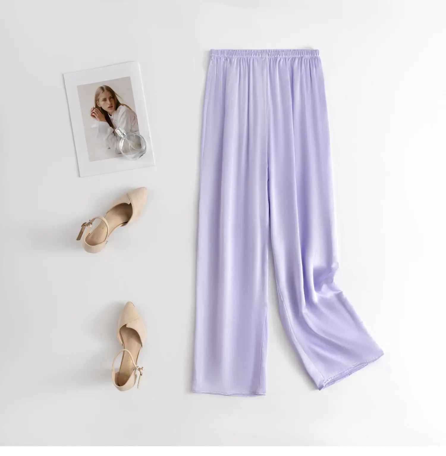22mm 100% natural mulberry silk satin, comfortable and skin friendly fabric. Purple pajama set with elastic waistband. Wearing it at home is very comfortable.