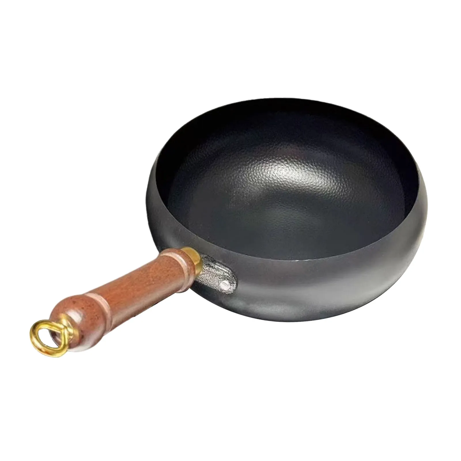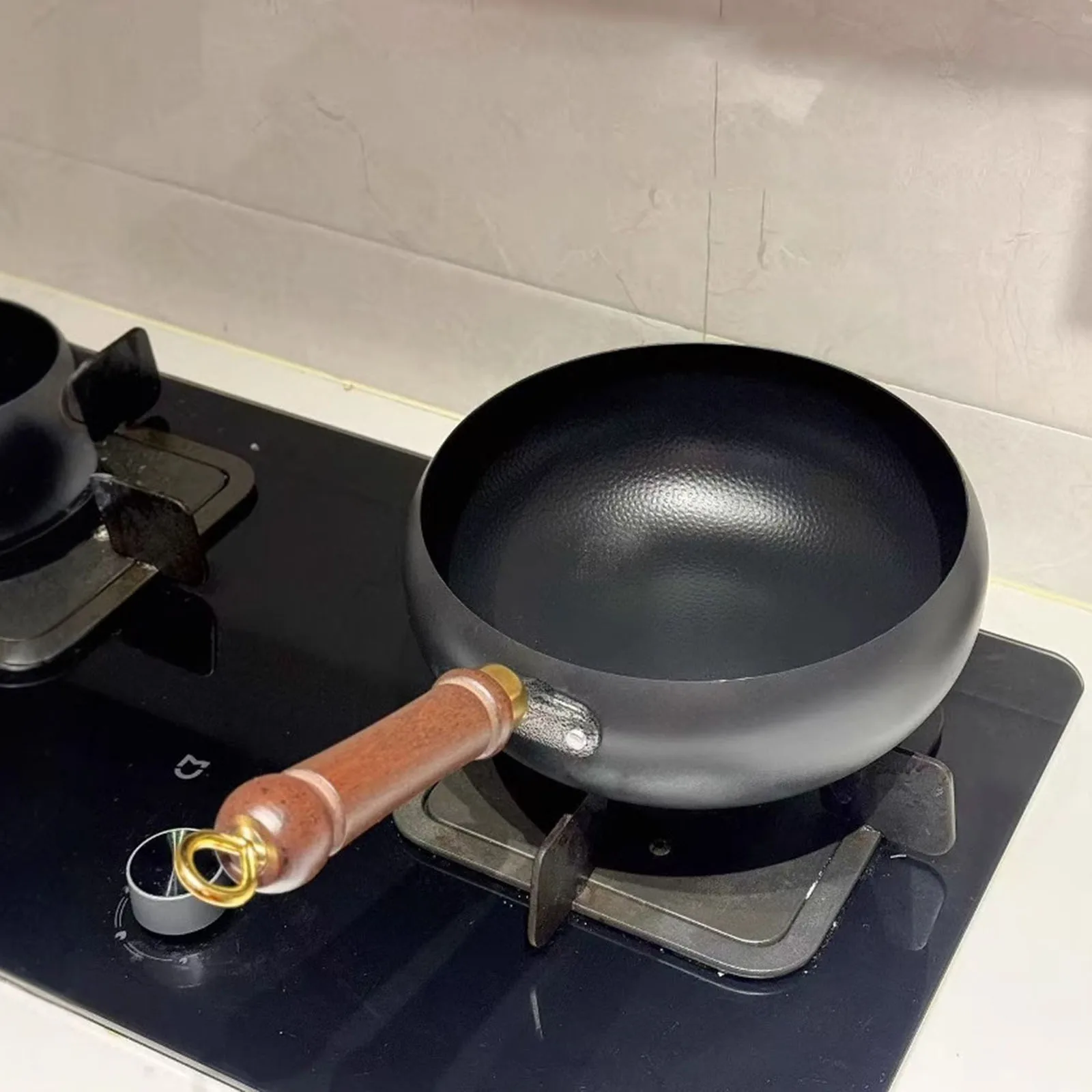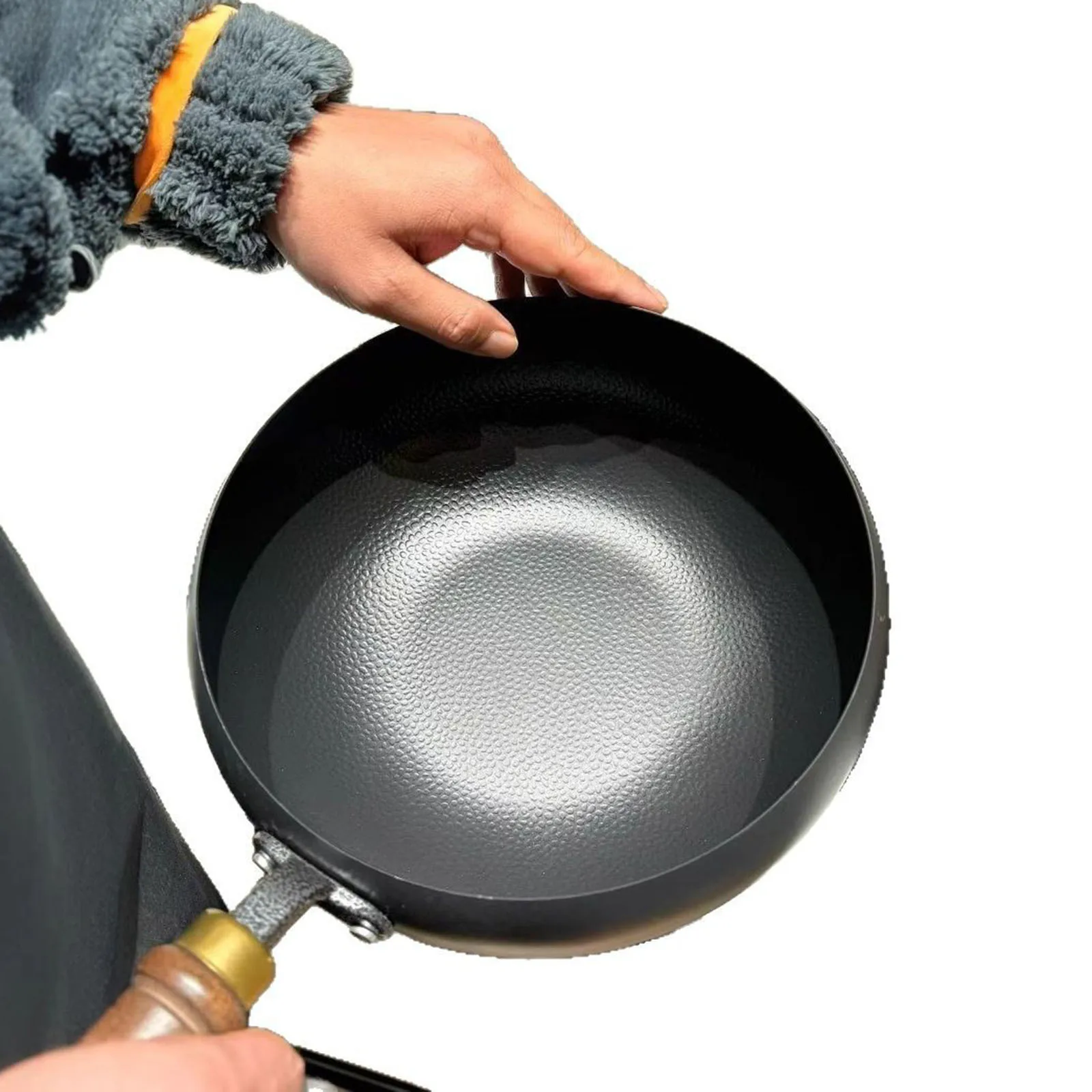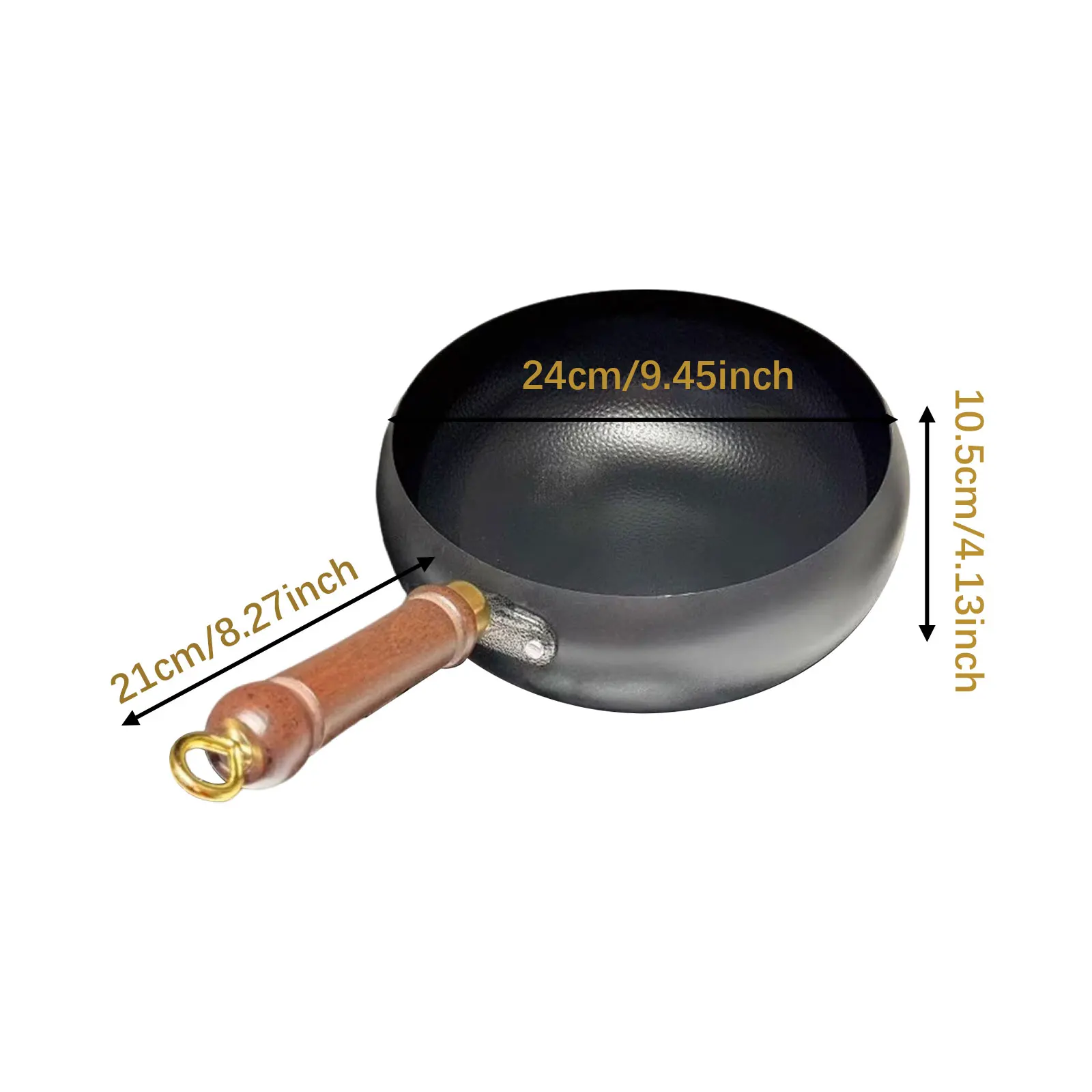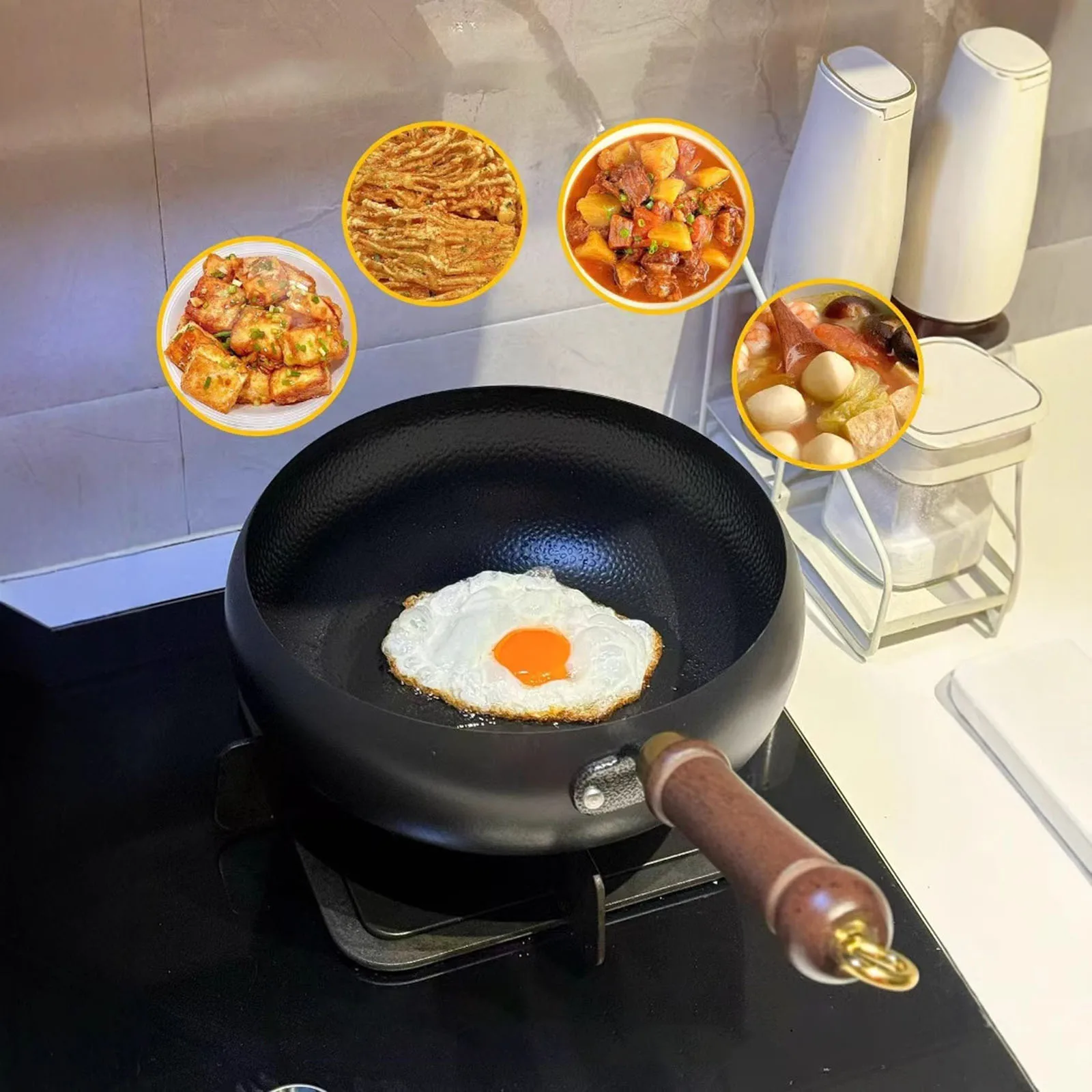 【Material】: This Non stick wok is made of refined iron material, uncoated surface, nonstick, Deep pot design, thick bottom and thin wall, conducts heat evenly and quickly.