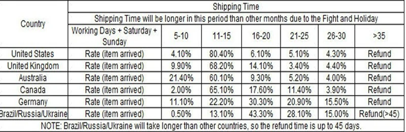 2)Items are shipped from China via Airmail, reaching most countries within 10 to 20 business days.Here is shiping time by China Air Post