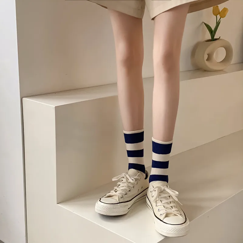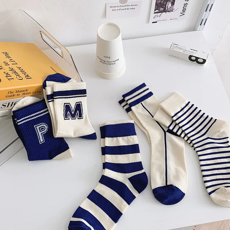 5 pairs of socks set, spring and summer new pure cotton women's socks, minimalist style, blue striped socks, women's sports socks