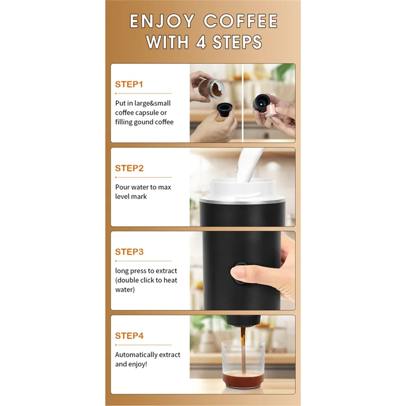3-in-1 Portable Electric Espresso Machine: This camping coffee machine is compatible with Ground Coffee/For Nespresso /for Dolce Gusto. The portable coffee maker has a powerful electric pump that can quickly produce high-pressure extraction coffee to ensure a rich taste of coffee. The portable espresso machine is like a mobile coffee shop, where you can enjoy the delicious coffee anytime, anywhere. This espresso machine is a blessing for coffee lovers.