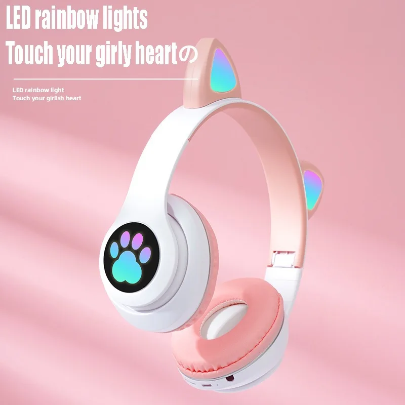 Over-ear cat Ear Bluetooth Headphones, Wireless 5.0 Gaming HiFi Stereo Sound Cord Microphone, LED Colorful Headphones