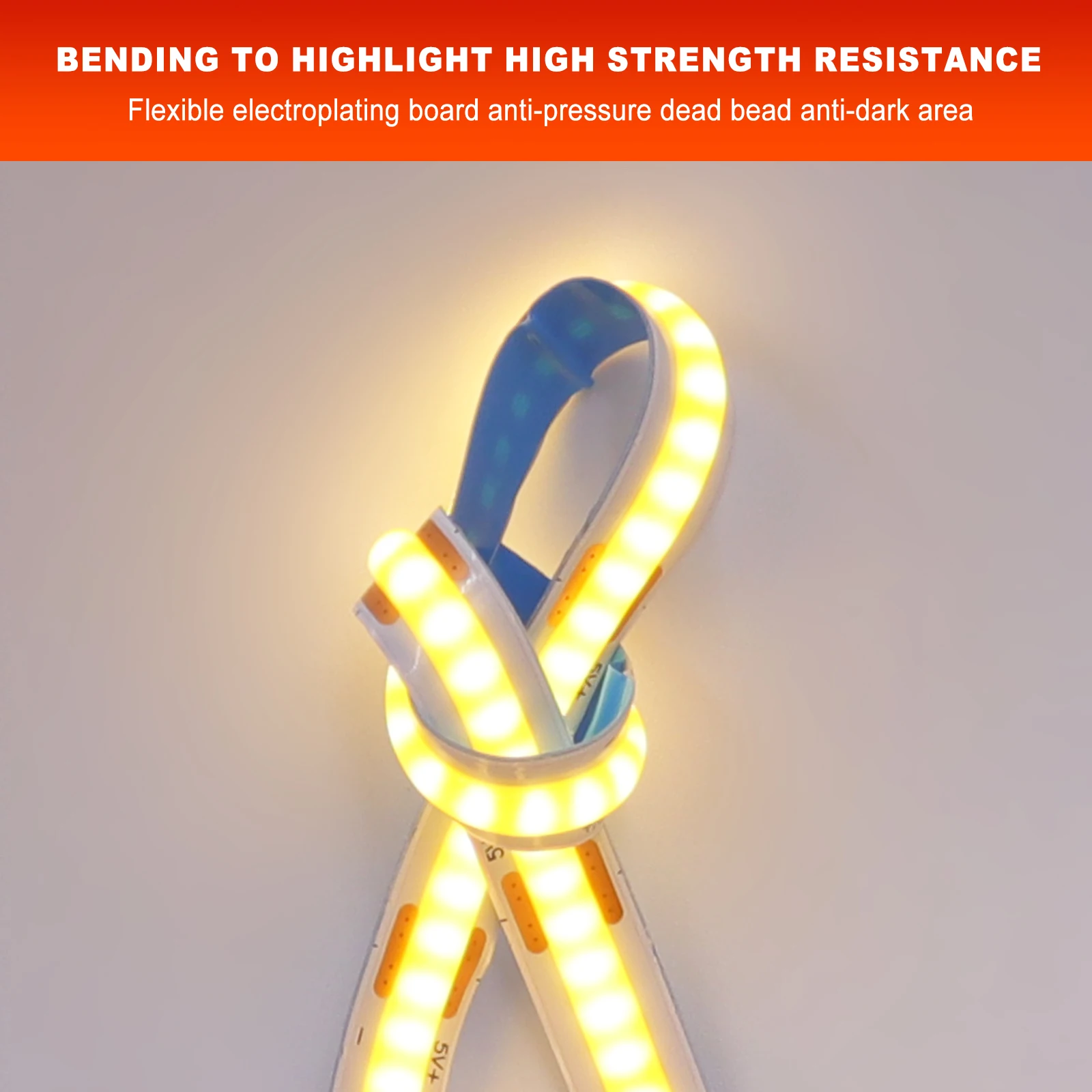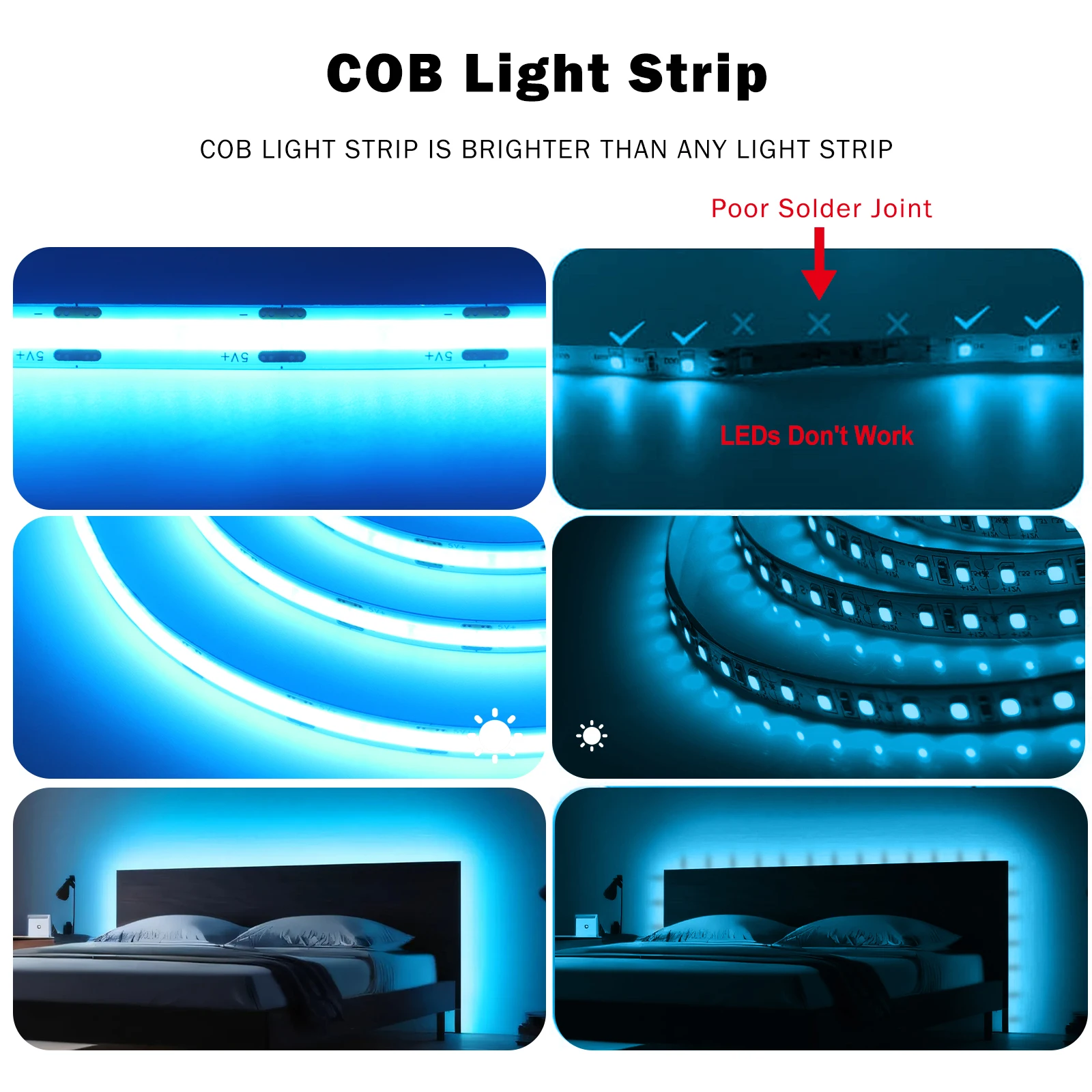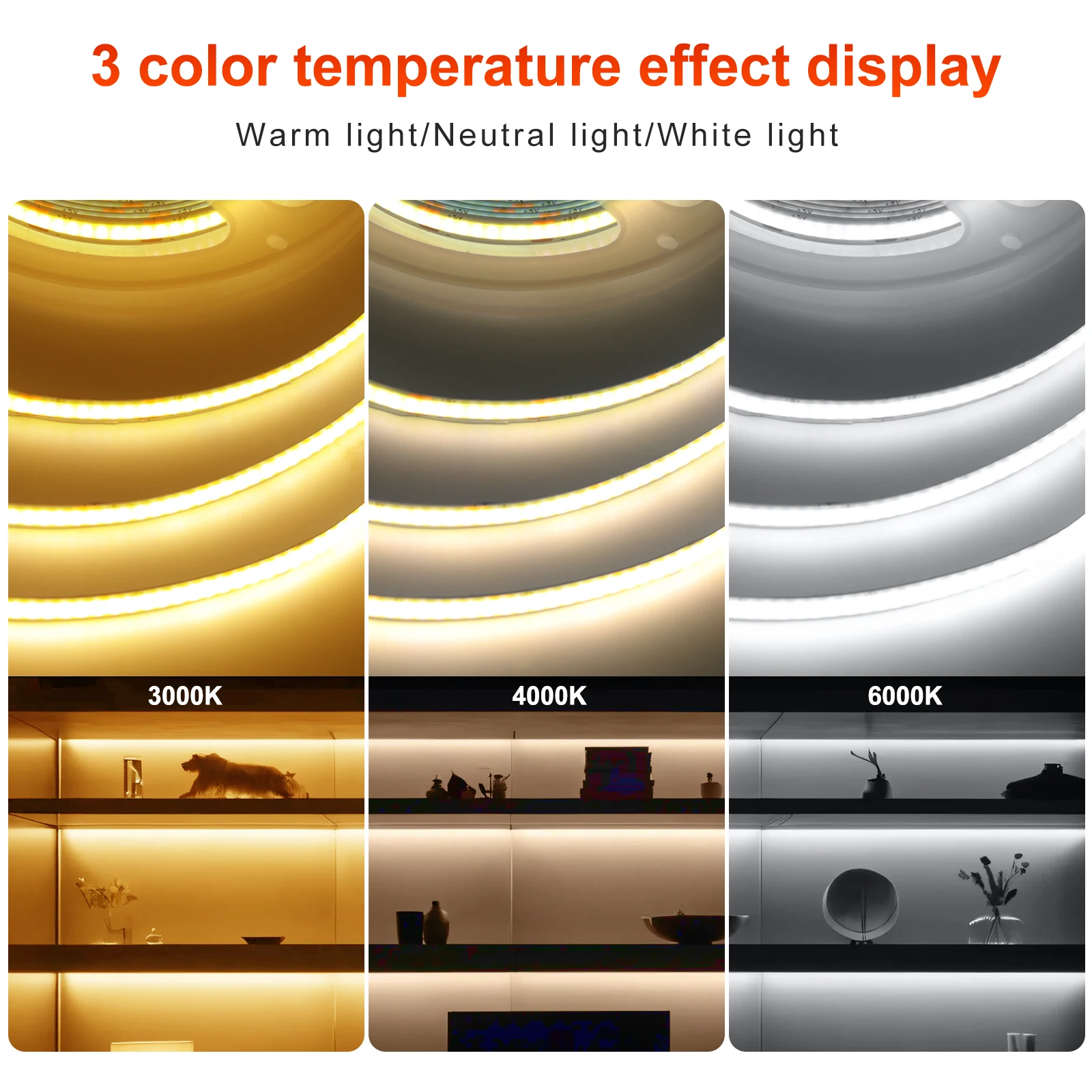 【COB LED strip】 COB light strips have more dense LED chips, Which make the emitting units nprecedentedly close to each other, and create super even lighting performance. At the same time, it brings higher luminous efficiency.