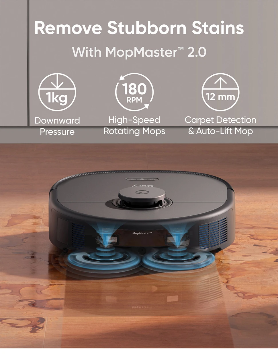When a carpet is detected, the mops automatically lift by 12 mm to prevent it getting wet.
