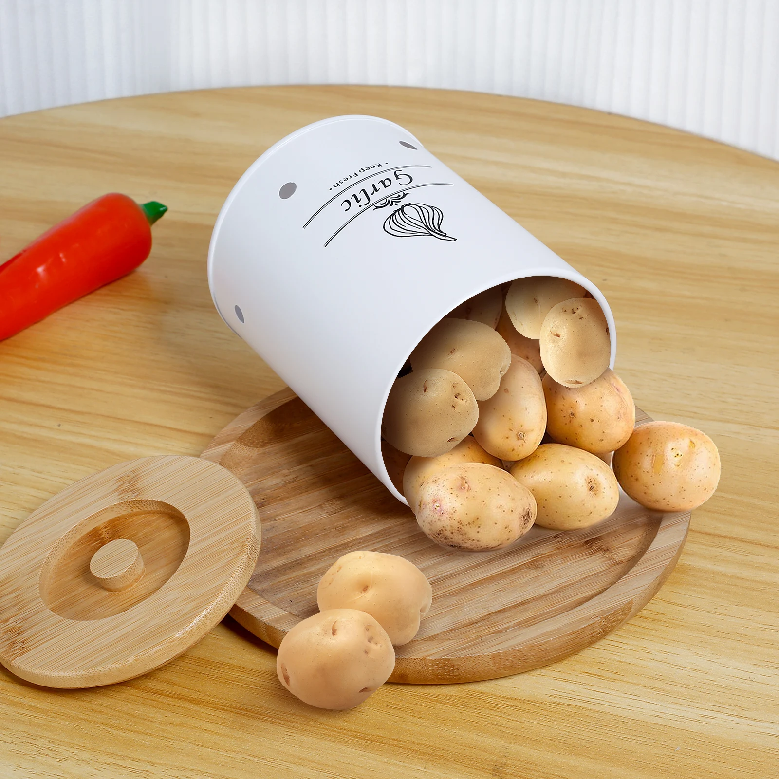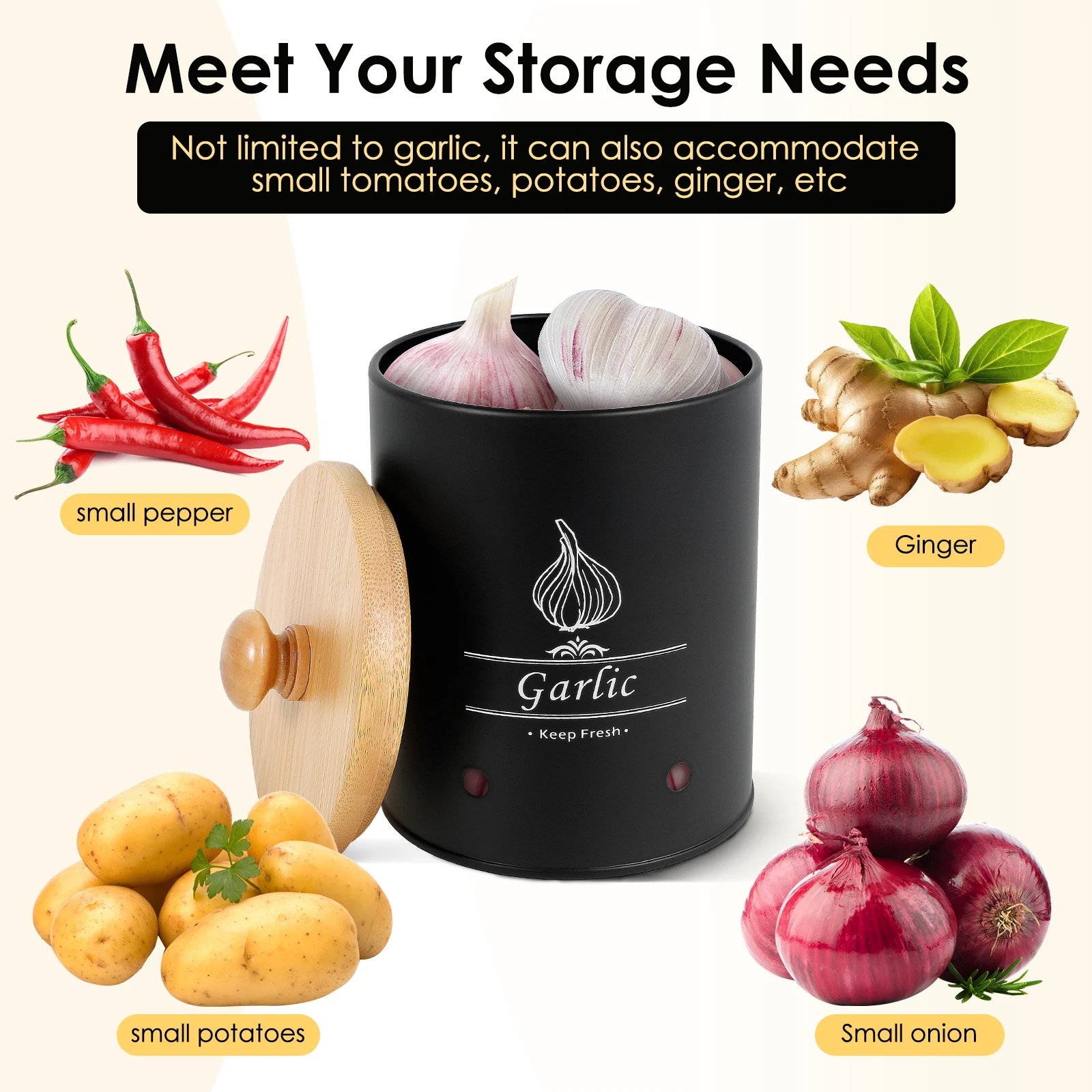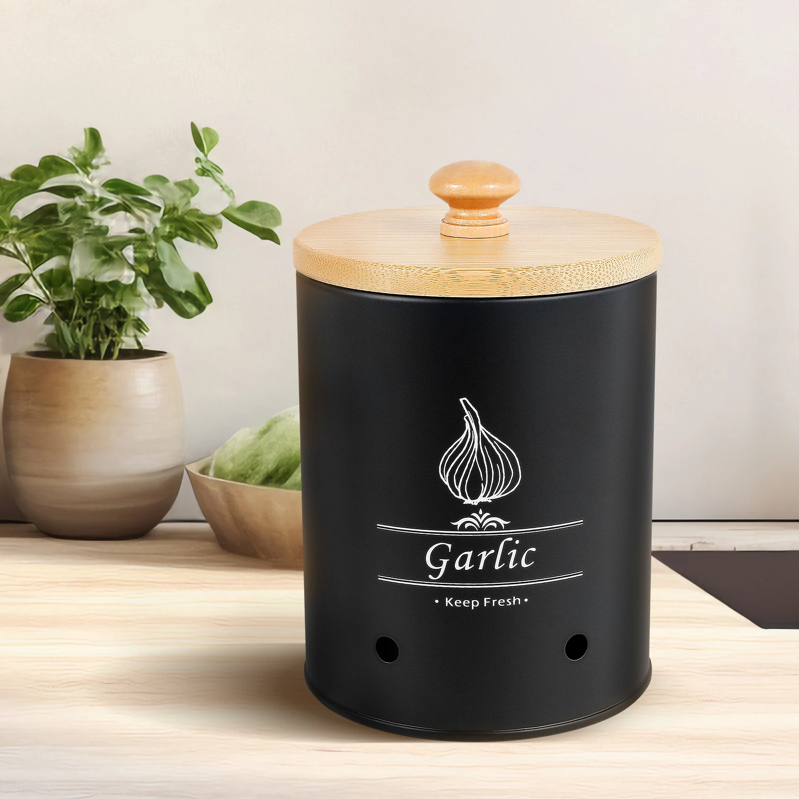 This garlic storage jar with lid is made of carbon steel and bamboo and is healthy. It is decorated with garlic illustrations and a printed design of garlic's English name, adding a touch of craftsmanship. The garlic jar is designed with ventilation vents to improve the ventilation inside the tank and ensure that your garlic stays fresh for longer.
