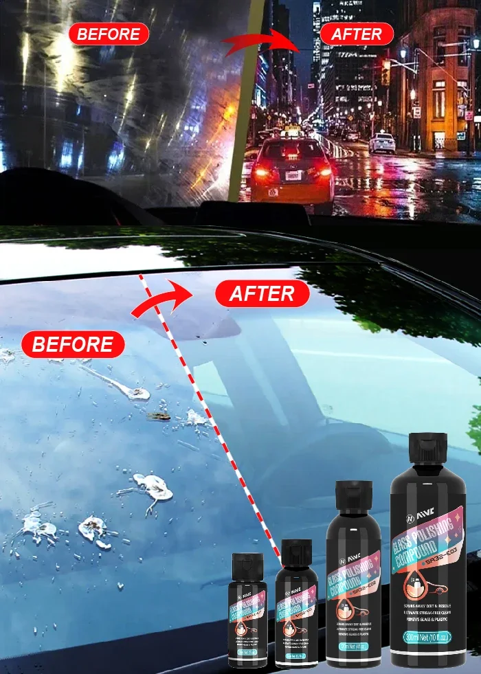 Causes of auto glass oil film formation: car exhaust, pollution and resin. There is a lot of pollution in the air, and if left untreated for a long time, it will become an oil film adhering to the car glassThis causes glare and makes the glass unclean. And when it rains, it makes water droplets hang on the glass and affect the Vision.