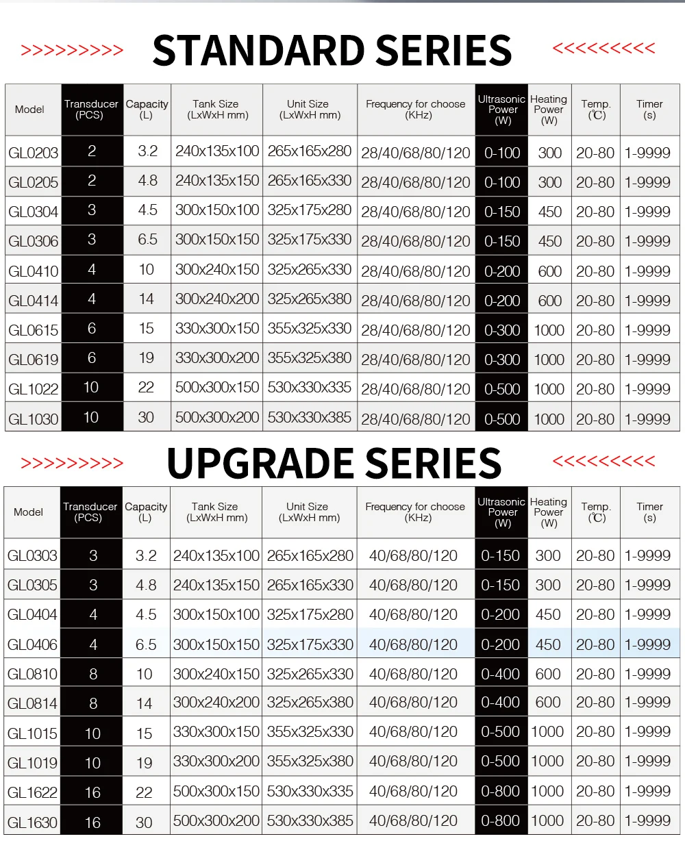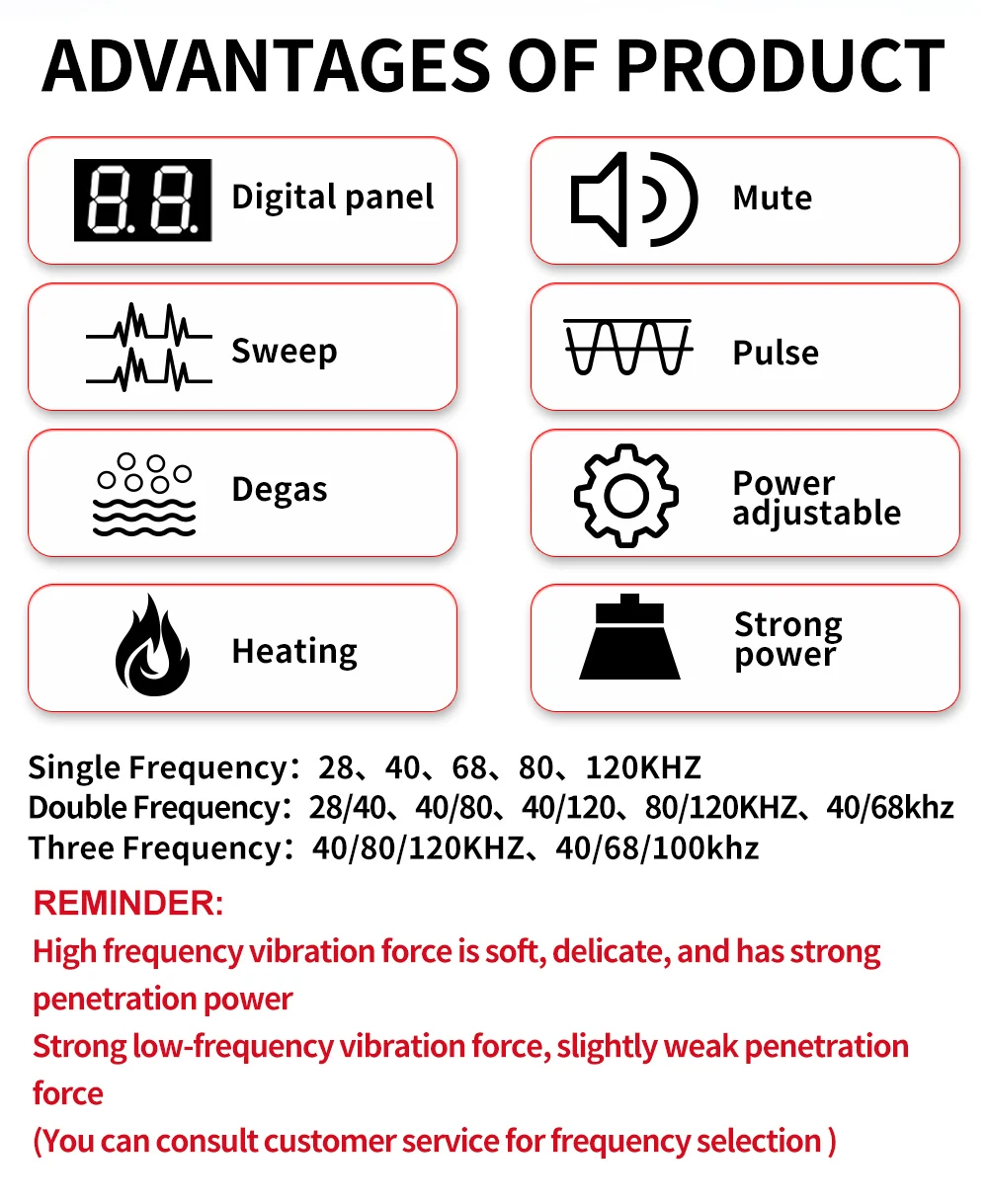 Ultrasonic Frequency: 28/40/68/80/120KHz