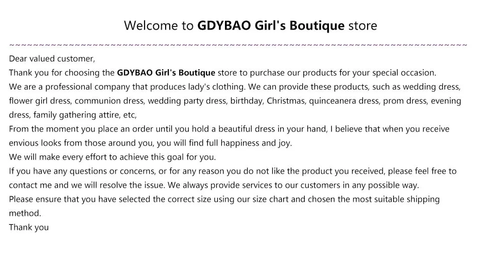 Before placing an order, please carefully measure your child's body measurements, including bust, waist, hip, hollow to floor, height, and so on.