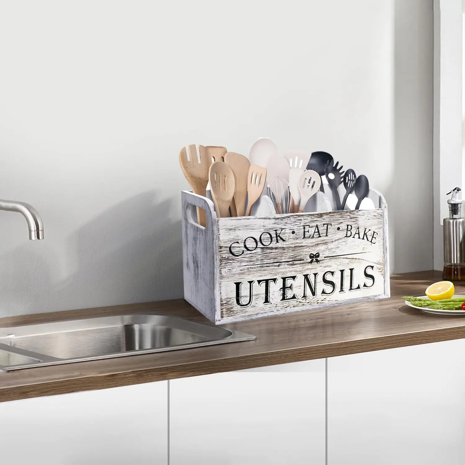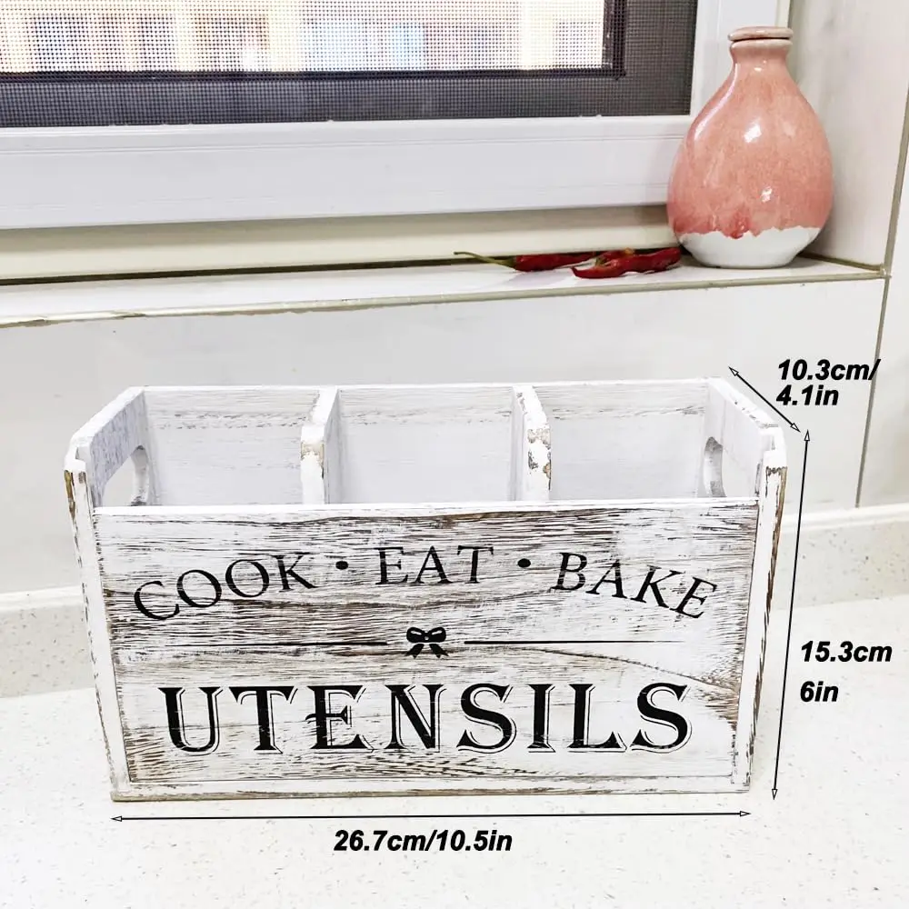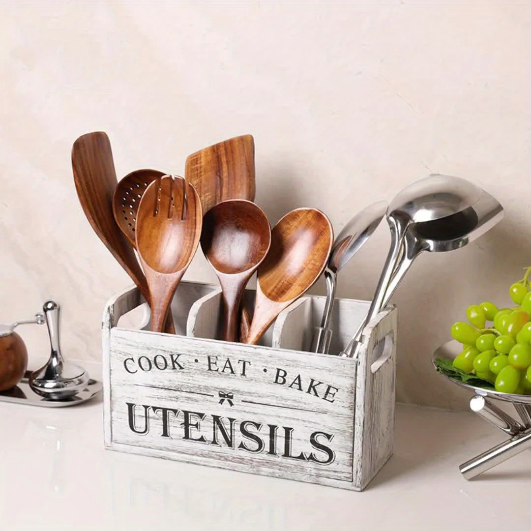 Kitchen Utensils Holder with 3 Compartments Wooden Utensil Organizer for Kitchen Countertop Kitchen Decor Cooking Utensil