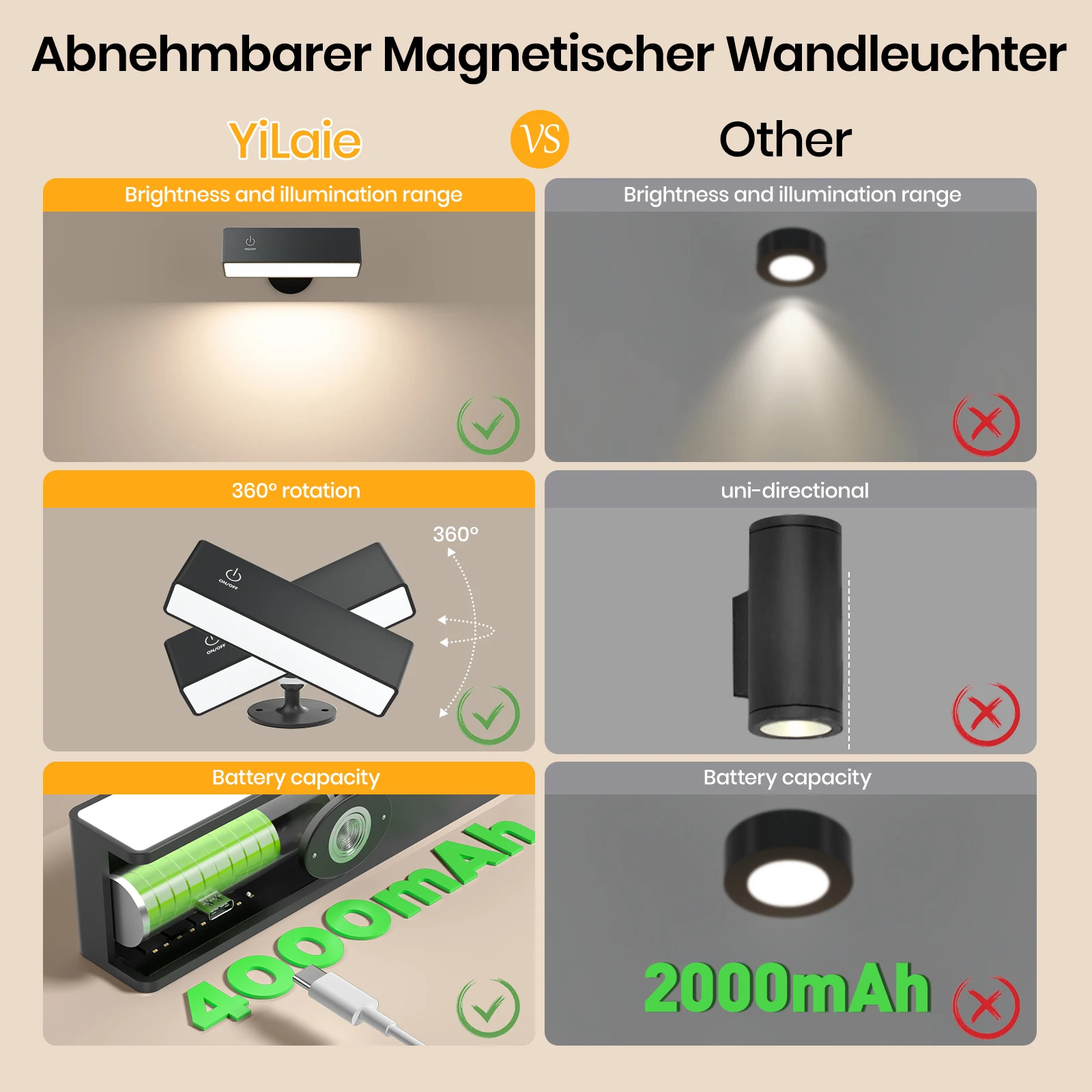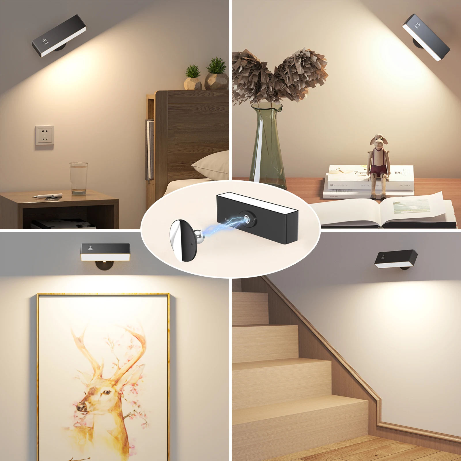 Material: High-quality PlasticInstallation Type: Wall MountedUsage: Daily lightingInstallation Method: Self-contained, with magnetic swivel head baseShade Direction: Up & DownLighting Area: 1-3 square metersNumber of light sources: > 20 LEDsTechnics: Advanced lighting technologyIs Dimmable: Yes, with stepless touch dimmingIs Smart Device: NoShade Type: Plastic, designed for durabilityBody Material: Plastic, ensuring longevityFeatures: 360° rotatable, cordless, rechargeable, with Type-C fast charging USB portis_customized: Yes, for personalized lighting needsSwitch Type: User-friendly touch On/Off SwitchIs Bulbs Included: Yes, with 4000mAh battery and 50 LEDsLighting Area: Versatile lighting coverage for 1-3 square metersApplication