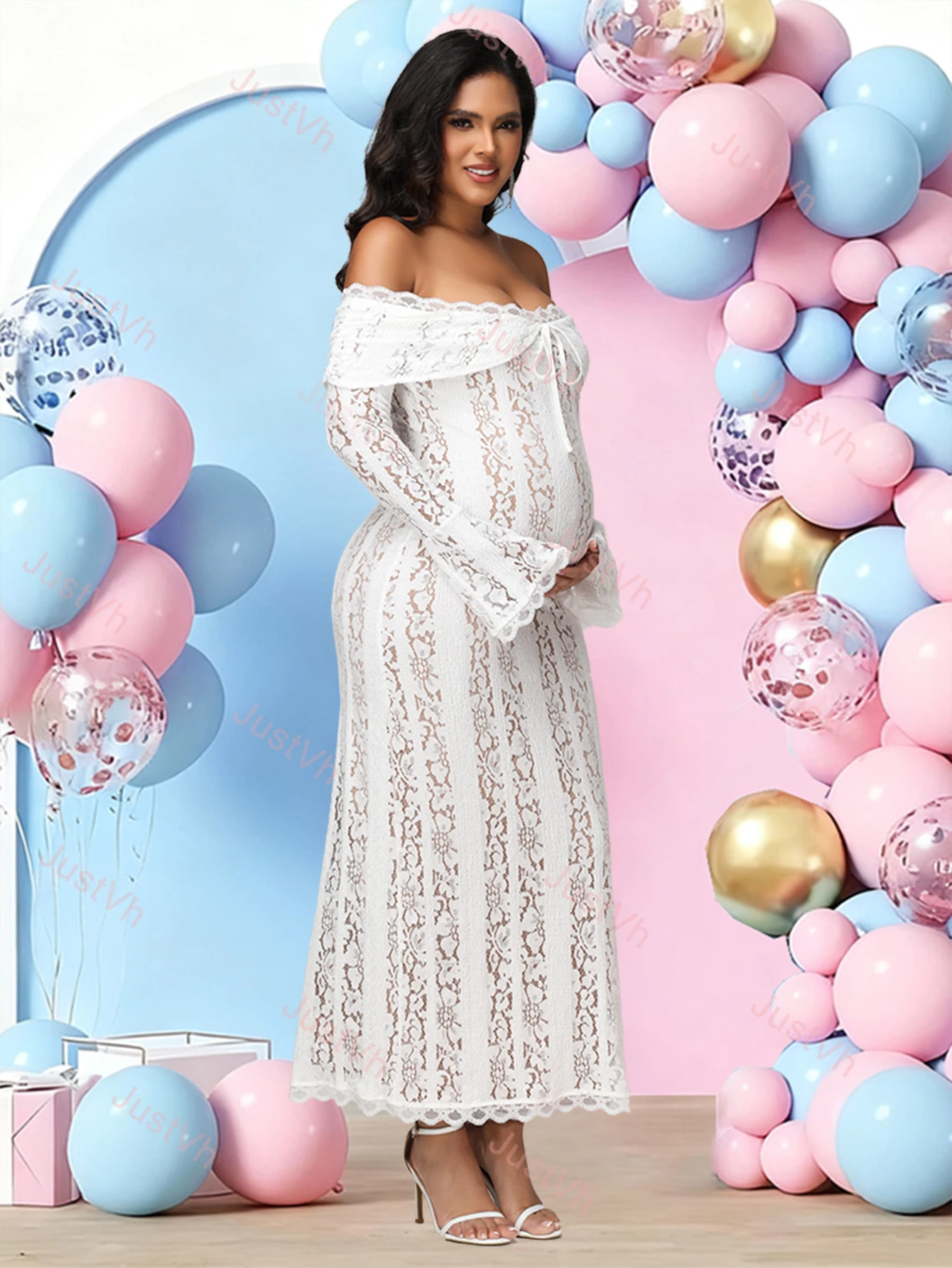❤Features: This maternity photography dress features lace off shoulder design with elegant flared sleeves, creating a stylish and romantic look. The lace and off shoulder design showcases your shoulders and curves.