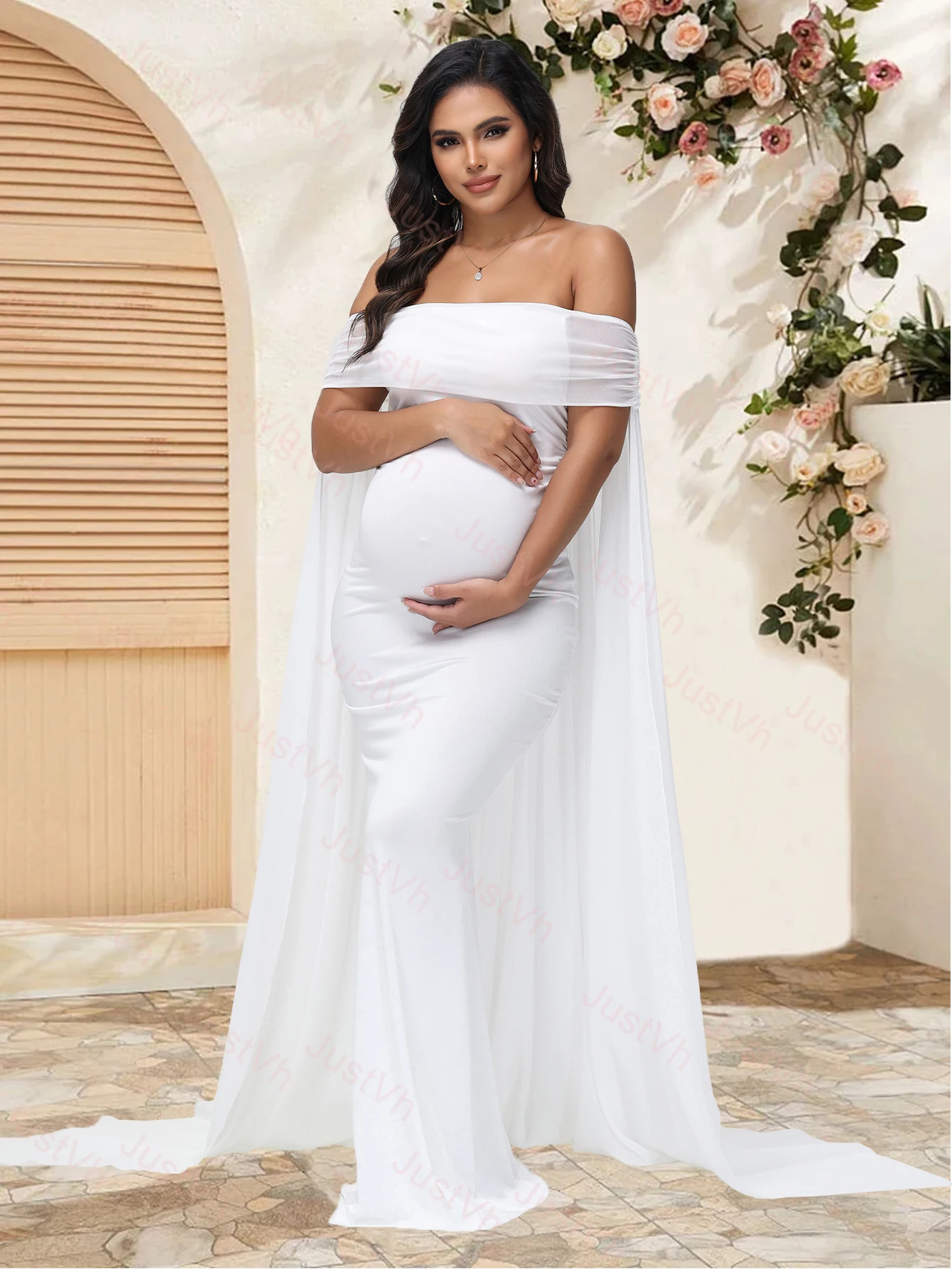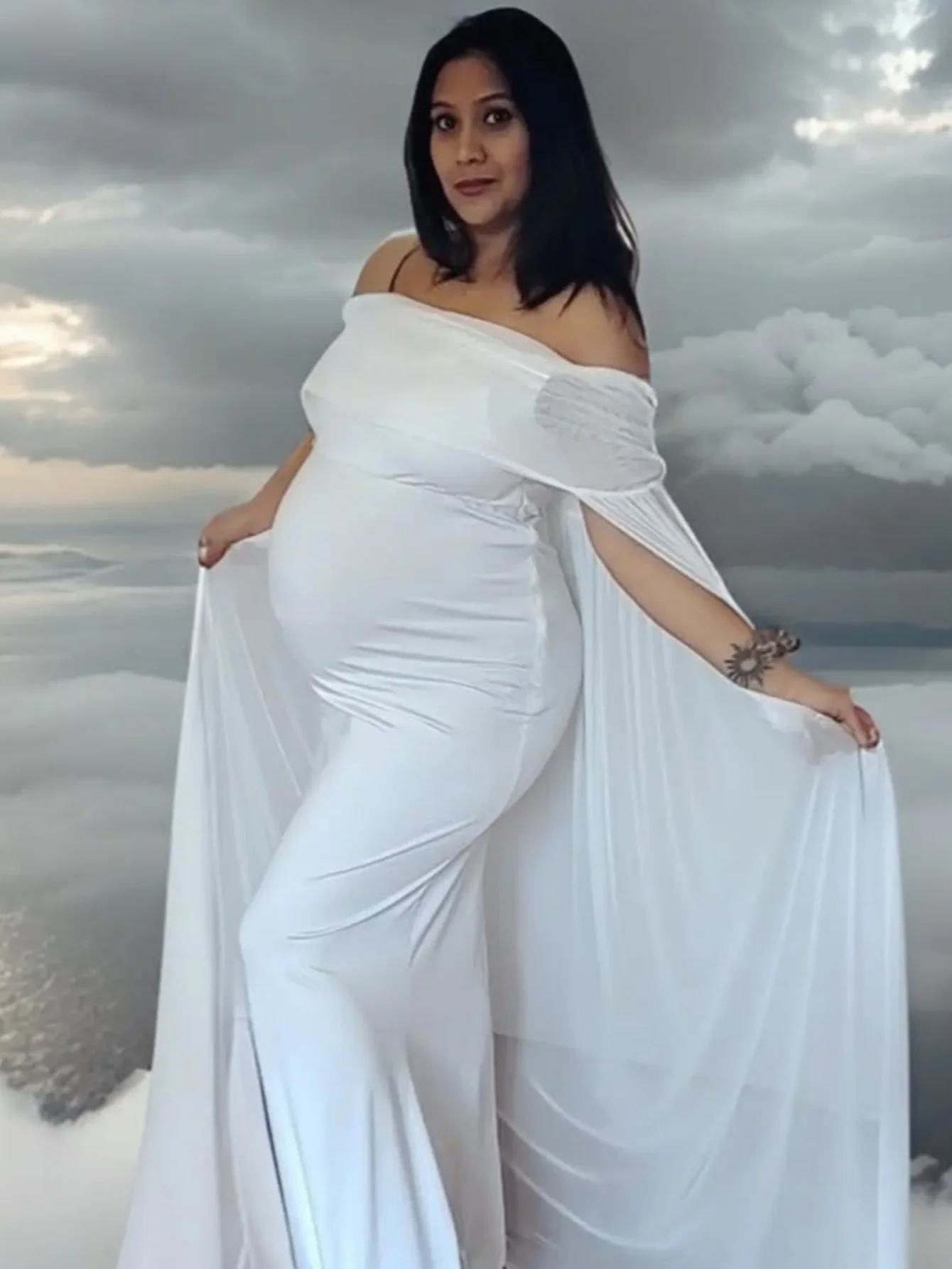❤Unique design:This photography prop dress adopts a design that combines one-shoulder and shawl, which is elegant and generous, while highlighting the shoulder and neck lines. The slim fitted design outlines mama's cute baby bump. Super soft, plenty of stretch for growing bumps.