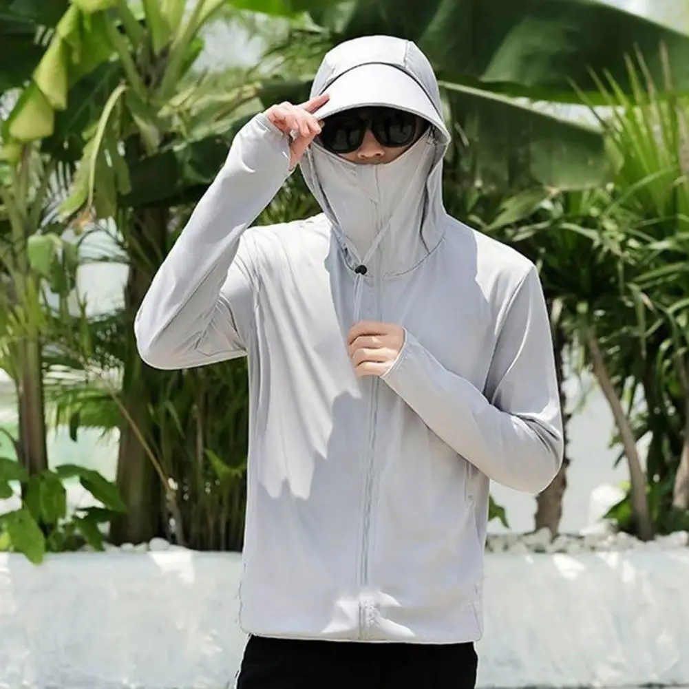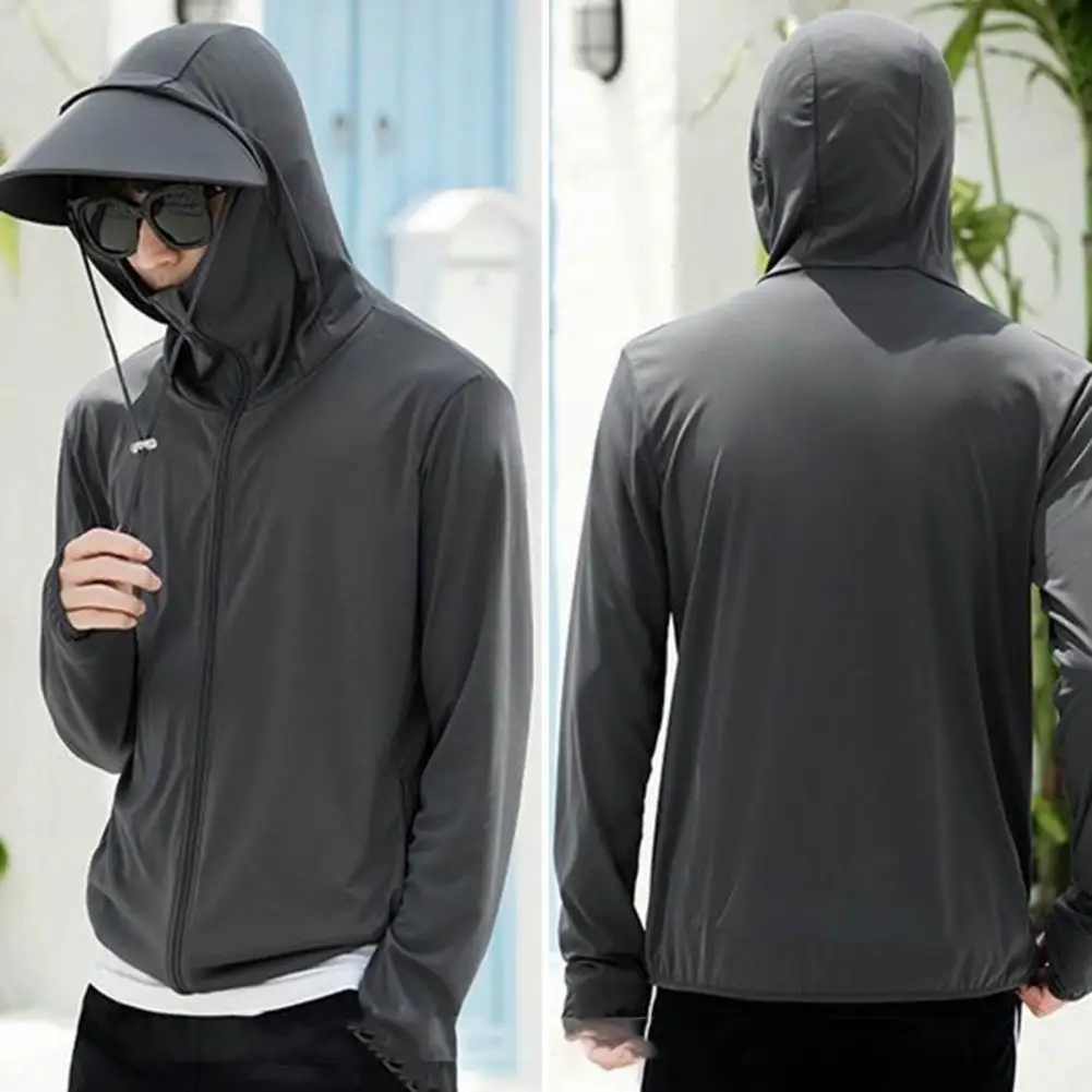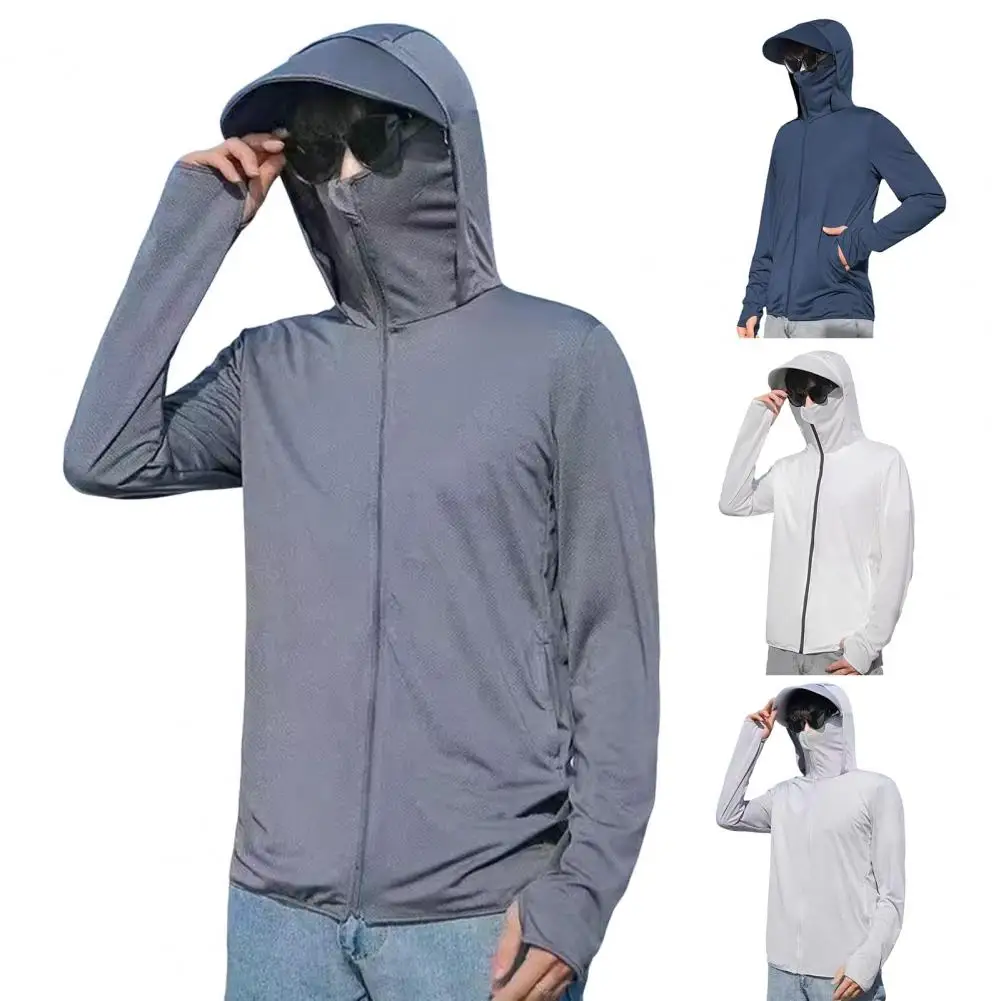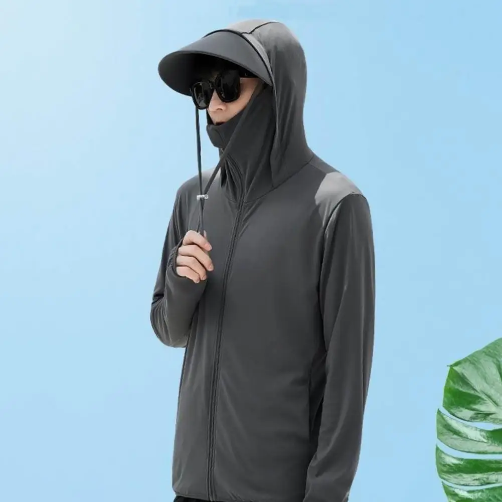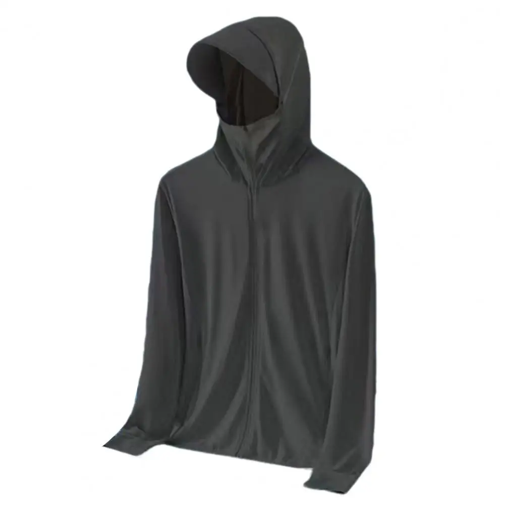 Men Summer Sun Clothing Hooded Drawstring Long Sleeve UV Coat Solid Color Zipper Placket Anti-UV Fishing Clothing