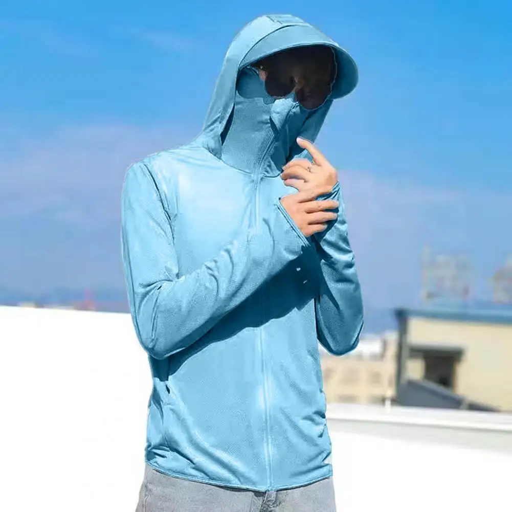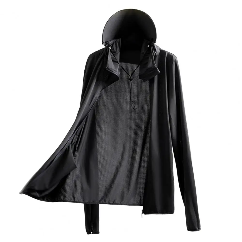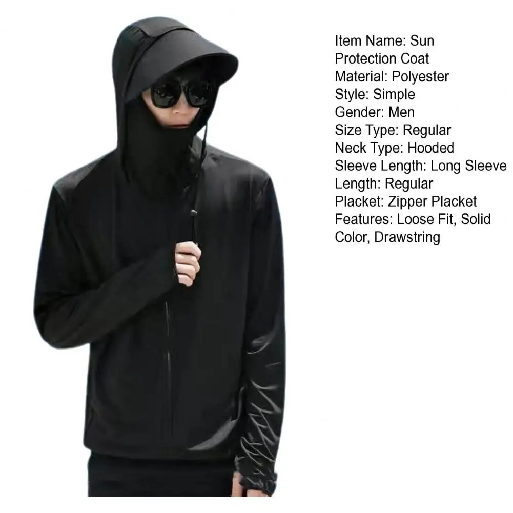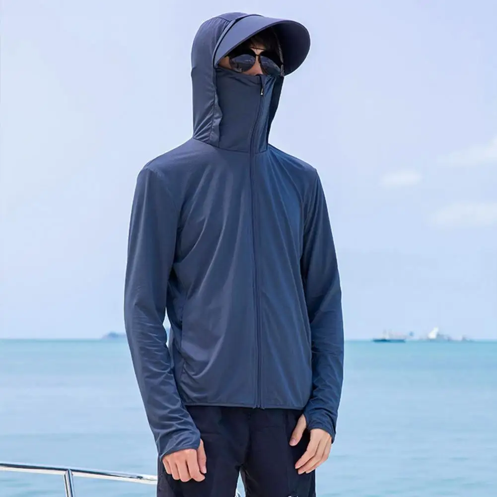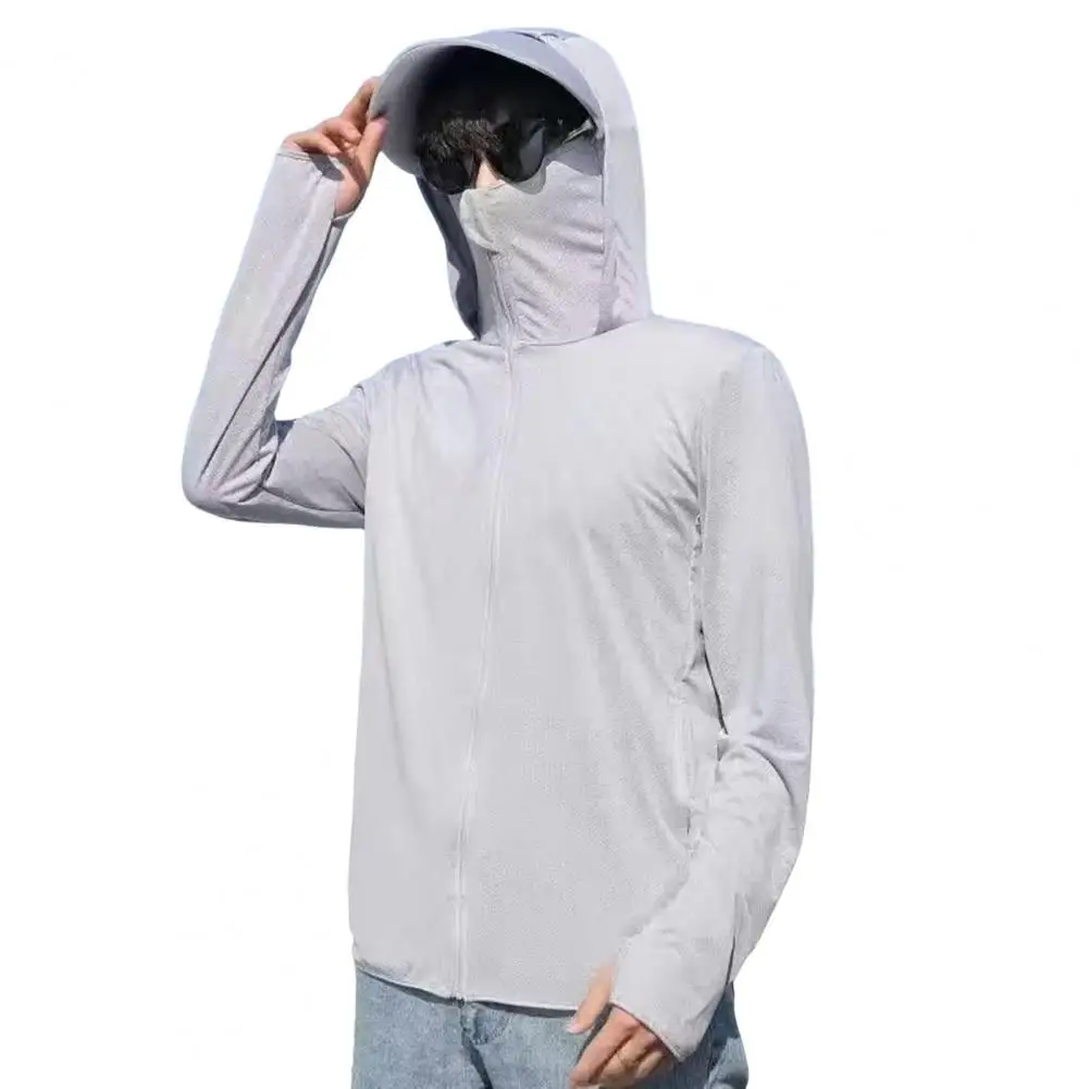 Men Summer Sun Clothing Hooded Drawstring Long Sleeve UV Coat Solid Color Zipper Placket Anti-UV Fishing Clothing