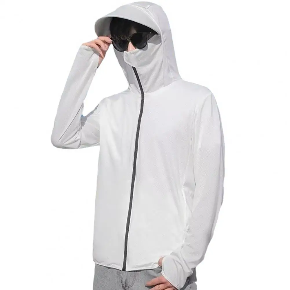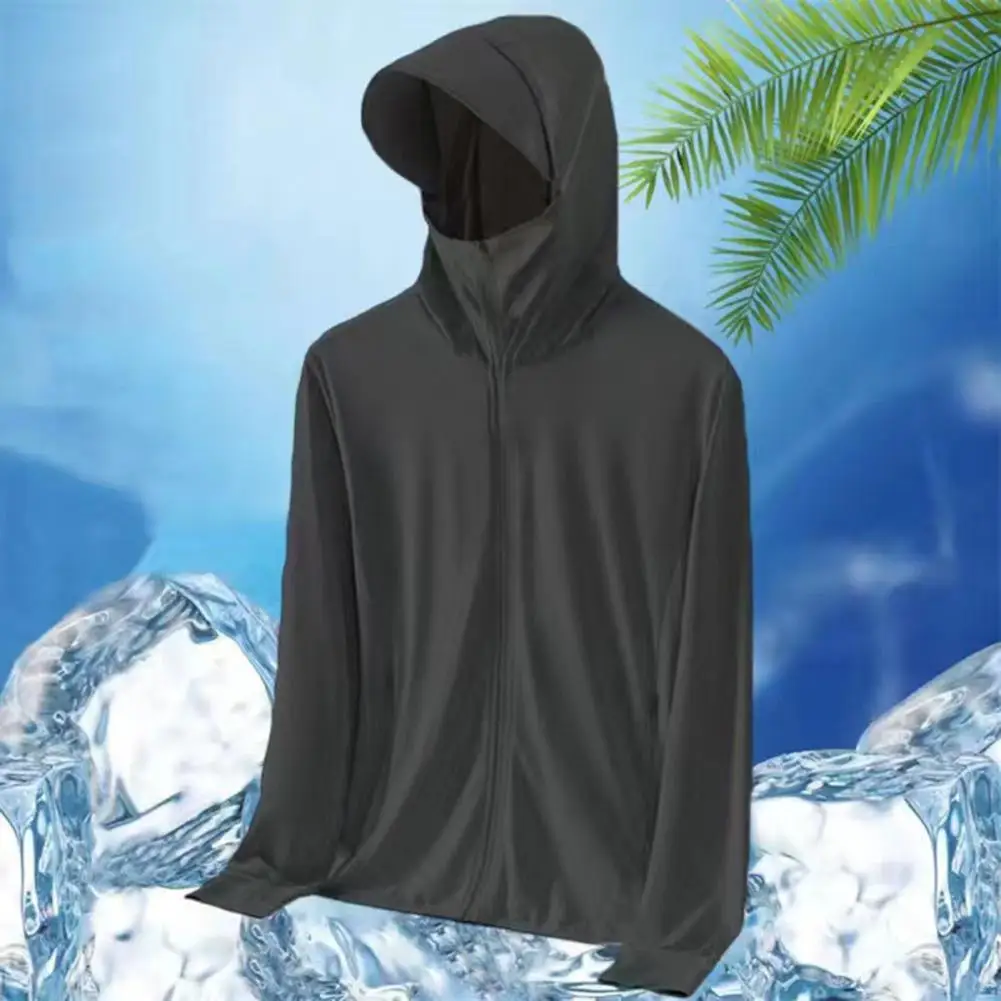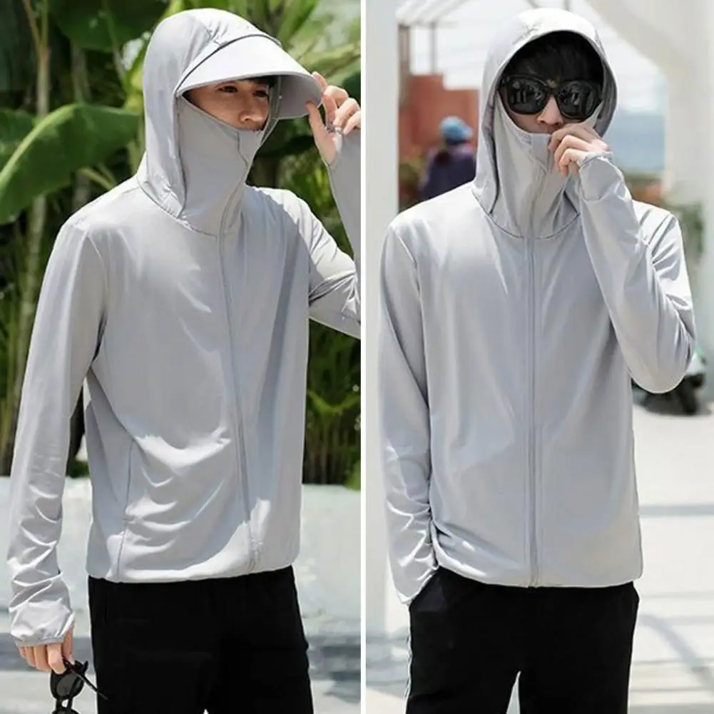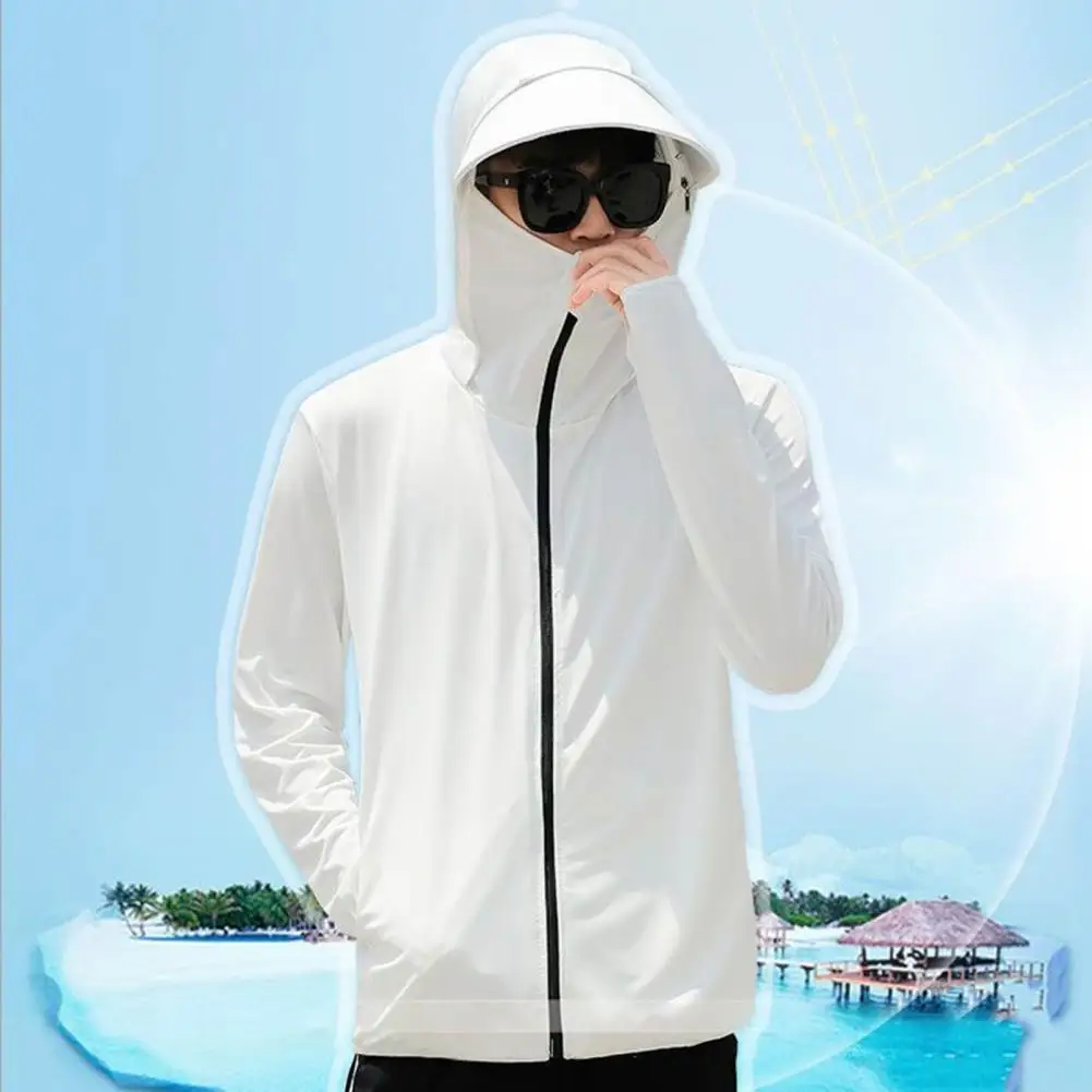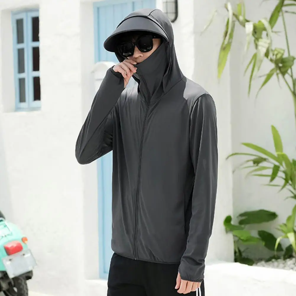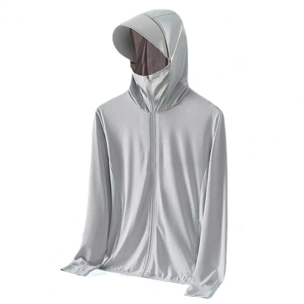 Men Summer Sun Clothing Hooded Drawstring Long Sleeve UV Coat Solid Color Zipper Placket Anti-UV Fishing Clothing