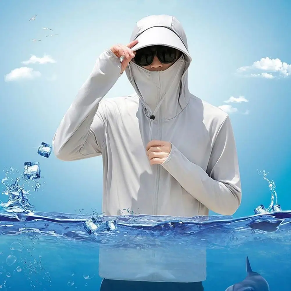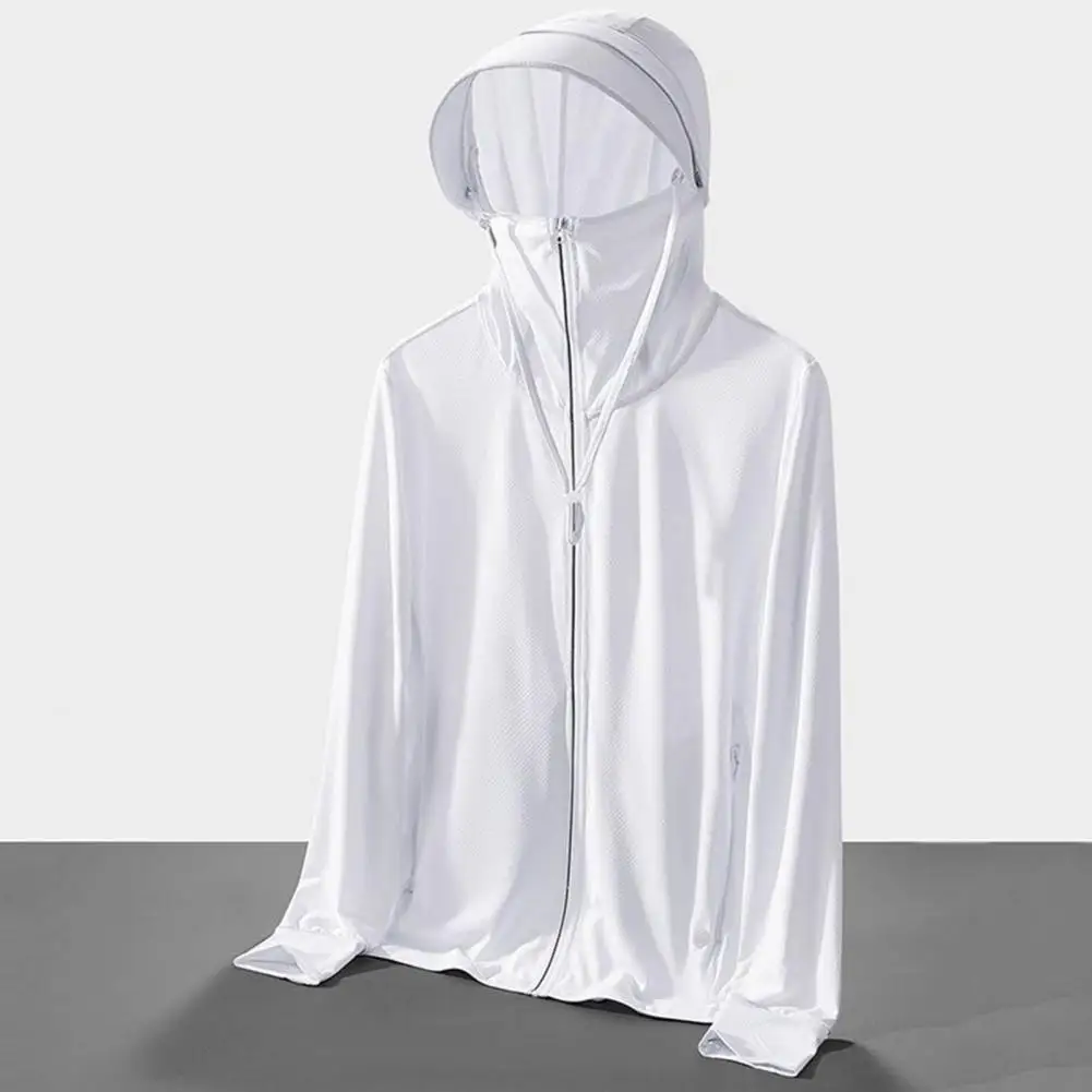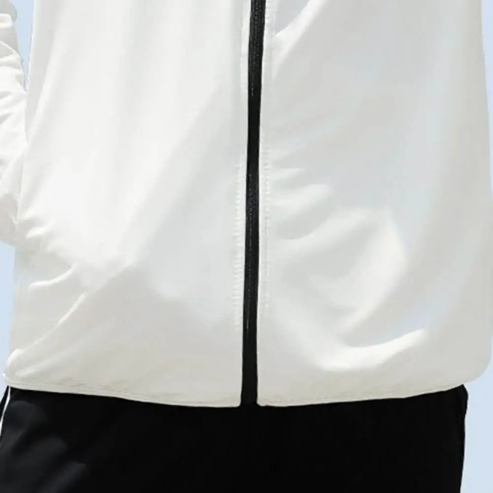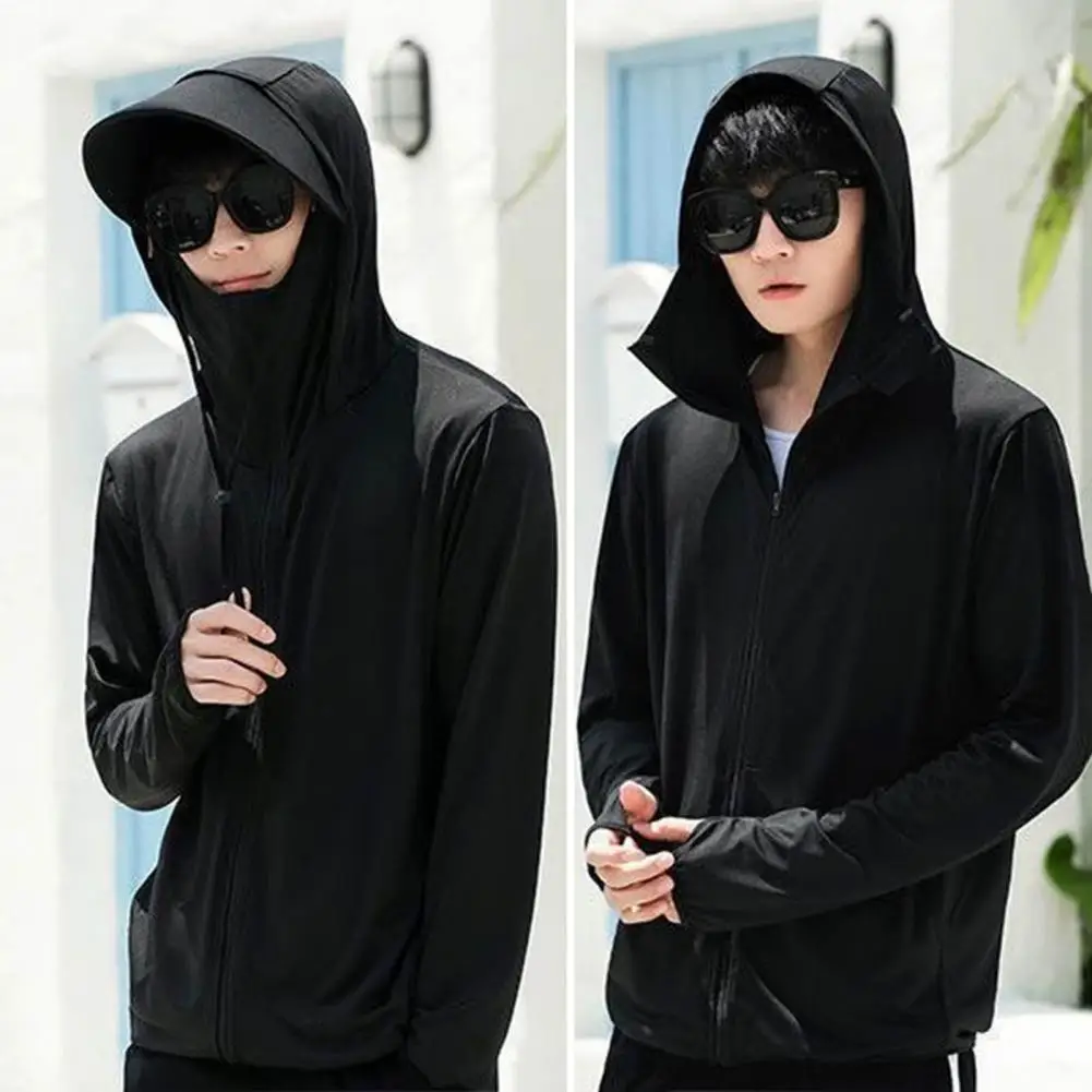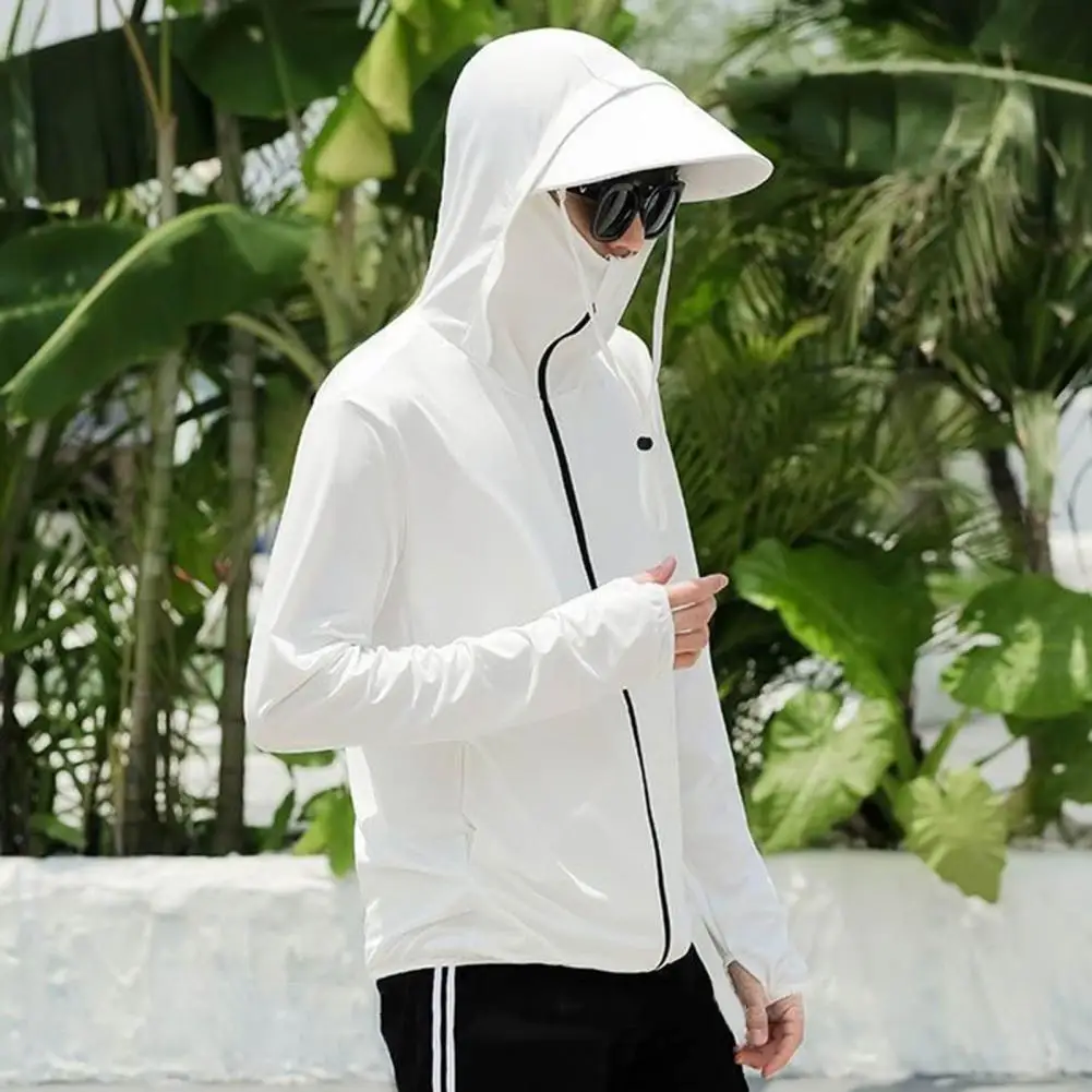 Men Summer Sun Clothing Hooded Drawstring Long Sleeve UV Coat Solid Color Zipper Placket Anti-UV Fishing Clothing