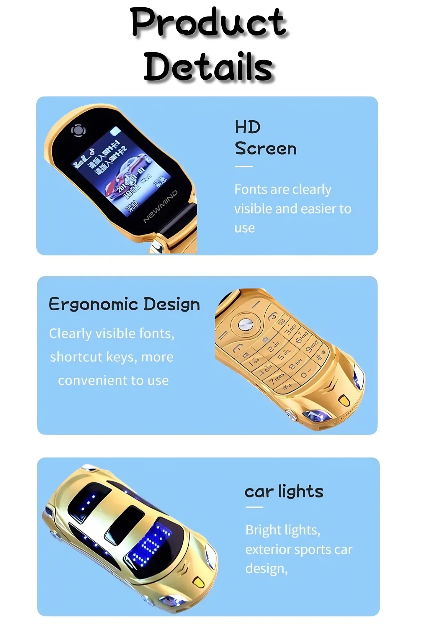 🚗 Unique Car Flip Design – A stylish mobile phone with a cool sports car shape, perfect for kids and collectors.