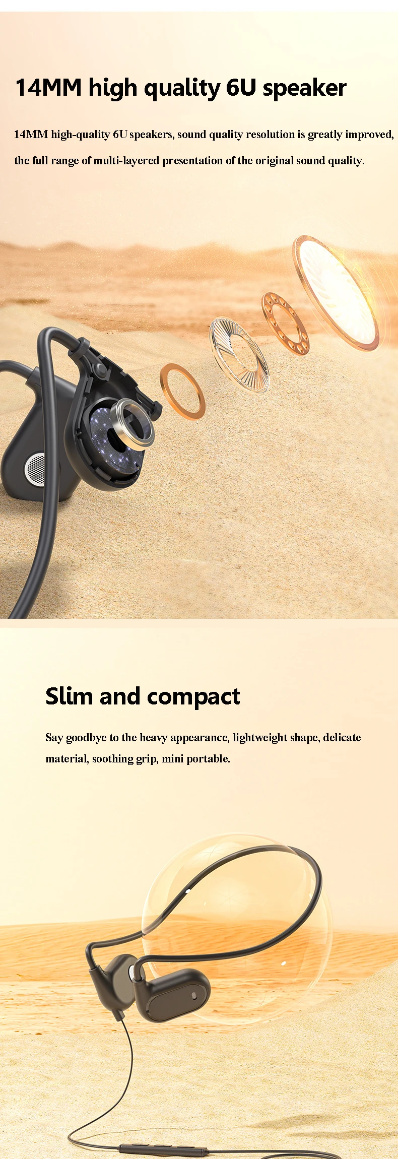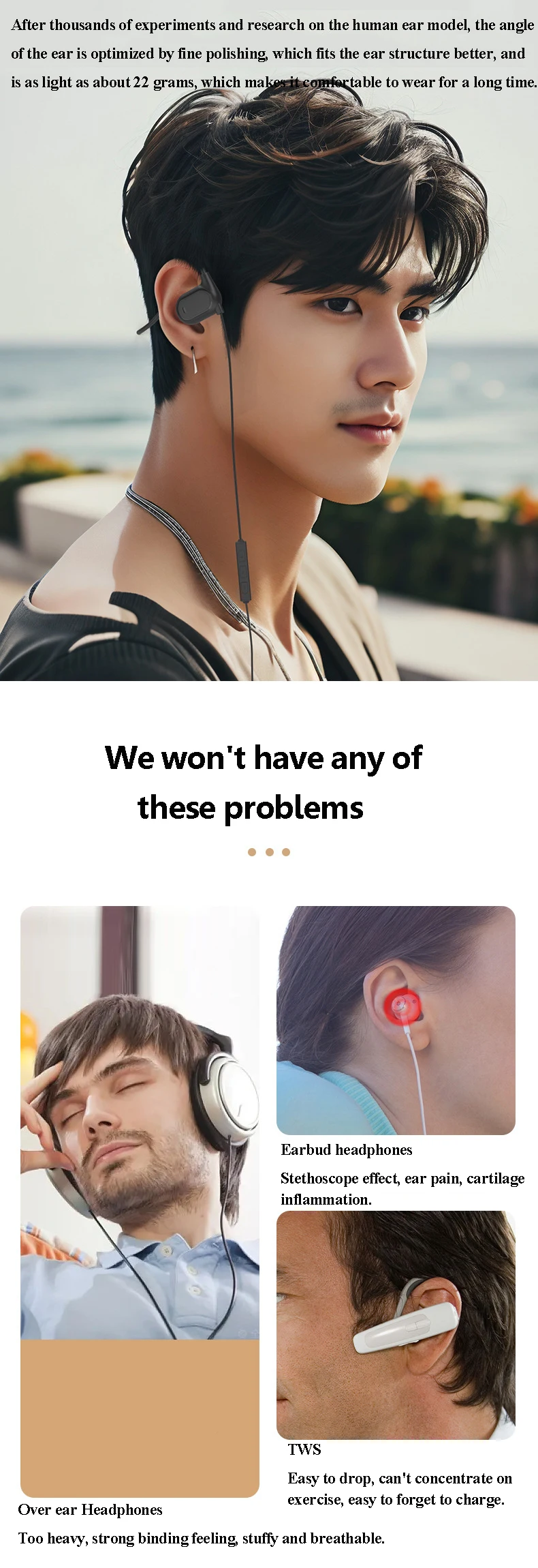After thousands of experiments and research on the human ear model, the ear angle is optimized by fine polishing, which fits the ear structure better, and is as light as about 22 grams, which makes it comfortable to wear for a long time.