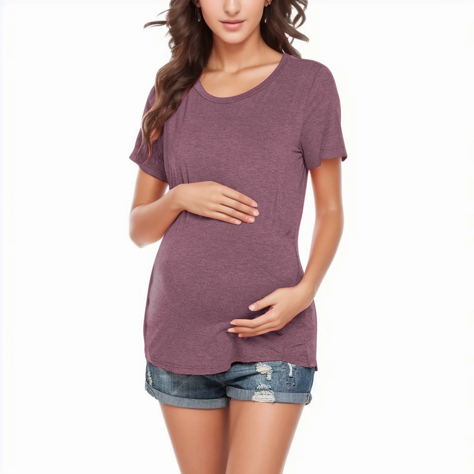 Womens Maternity Summer Short Sleeve Side Button Crew Neck Solid Color Nursing Tops T Shirt For Breastfeeding