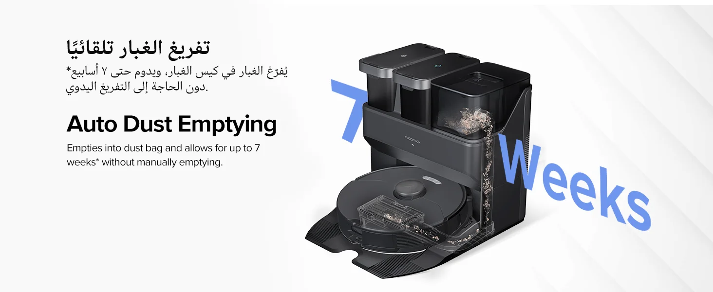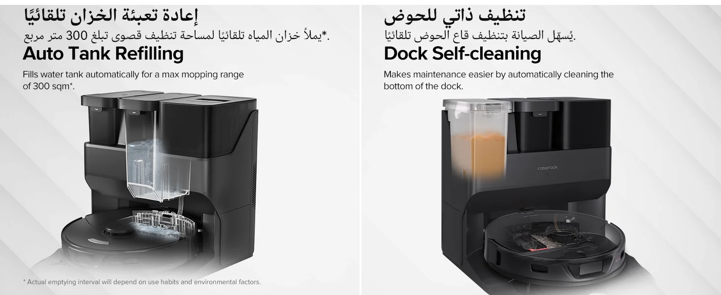 The emptying station adopts the latest emptying method, with a 2.5L dust bag, which can be cleaned once every seven weeks at most.Robot vacuum is also equipped with an independent 3L water tank and 2.5L dirt tank, which automatically replenishes water to the water tank before cleaning.