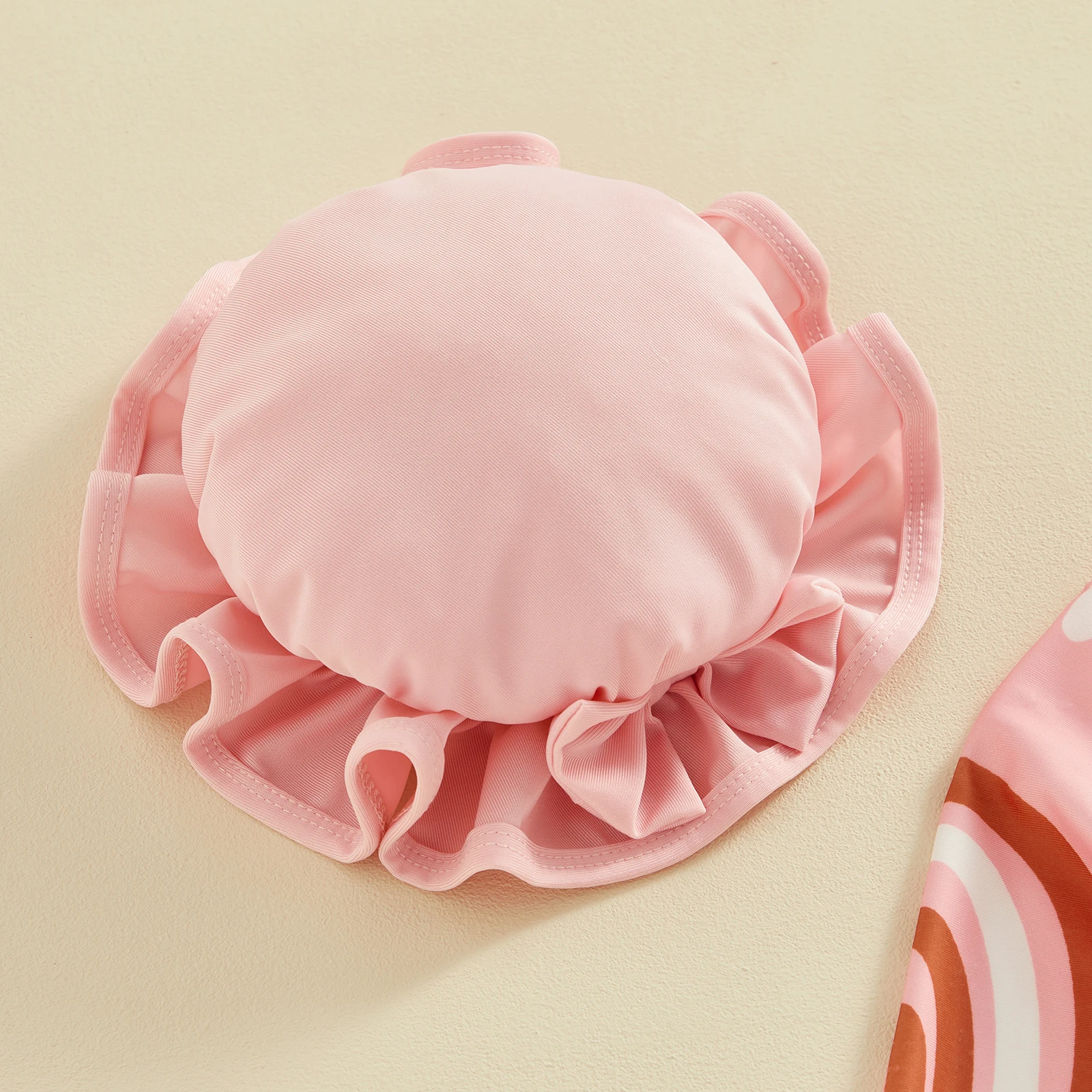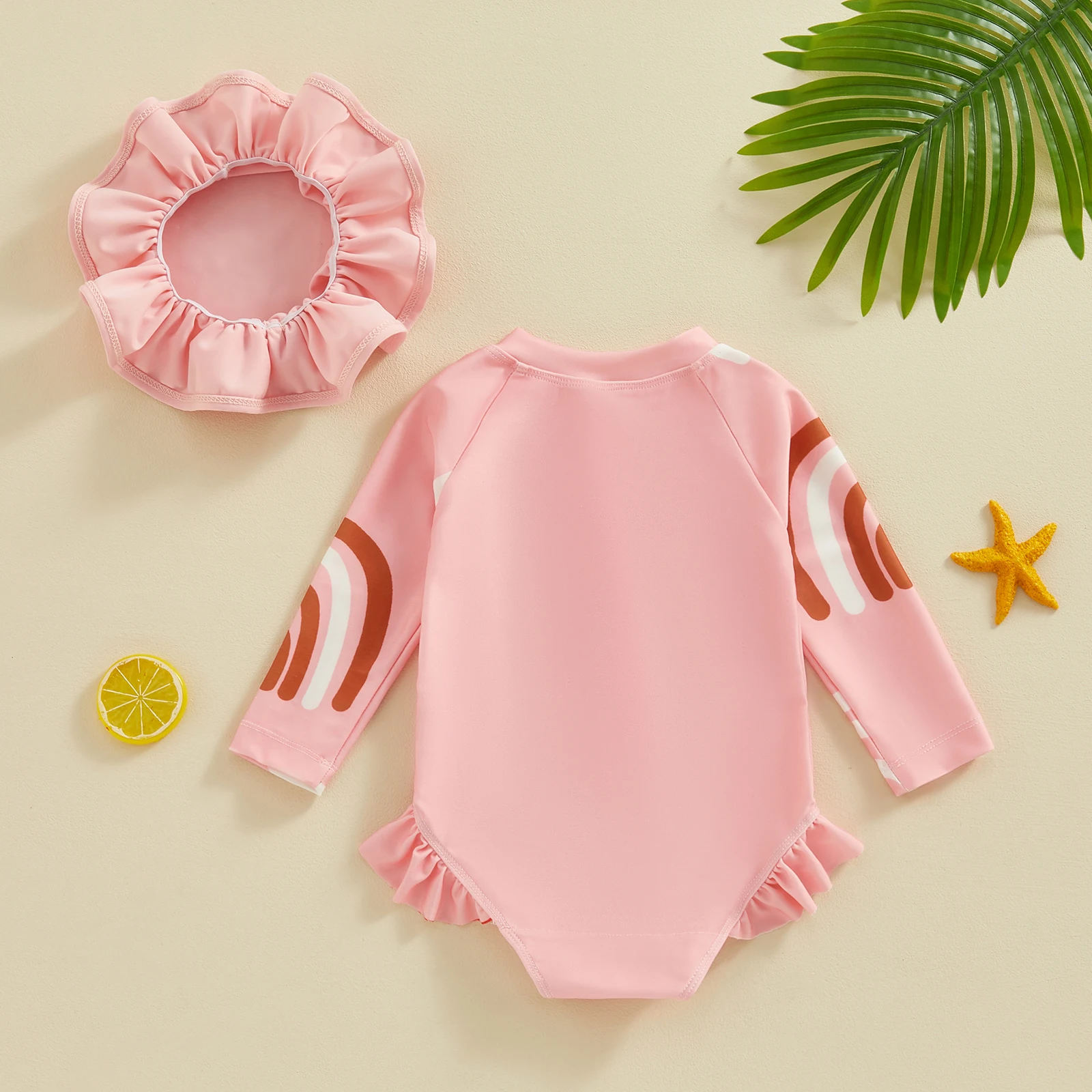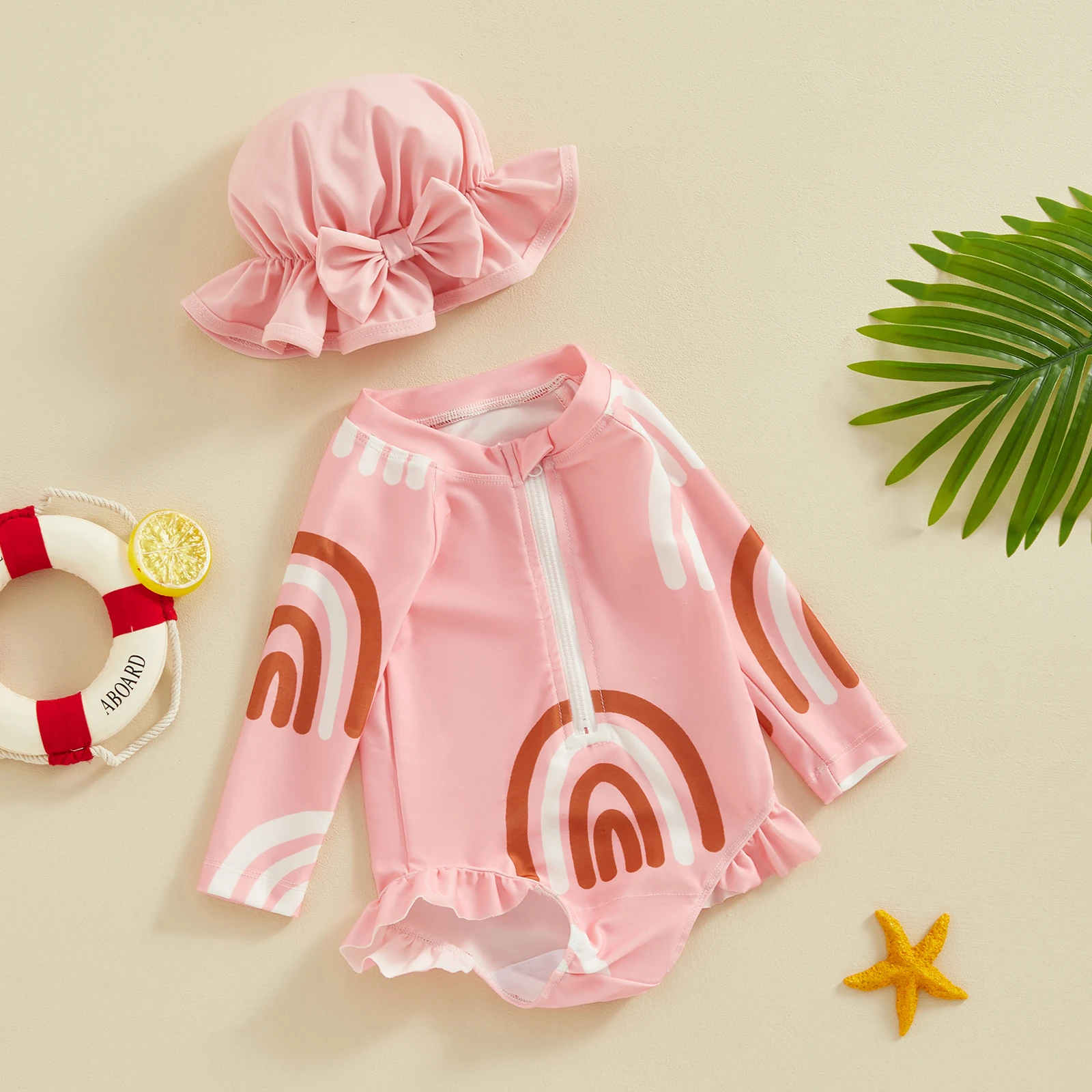 Baby Girls 2 Piece Bathing Suit Outfits, Round Neck Long Sleeve Zipper Swimsuit + 3D Bow Swim Cap Toddler Beach Wear Set