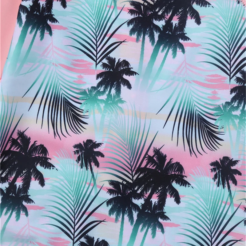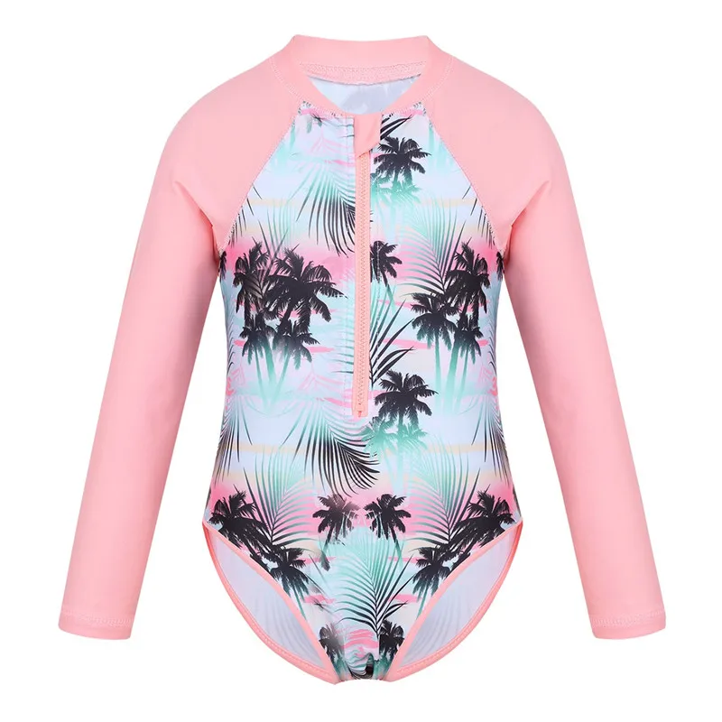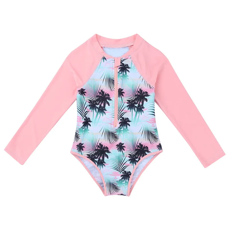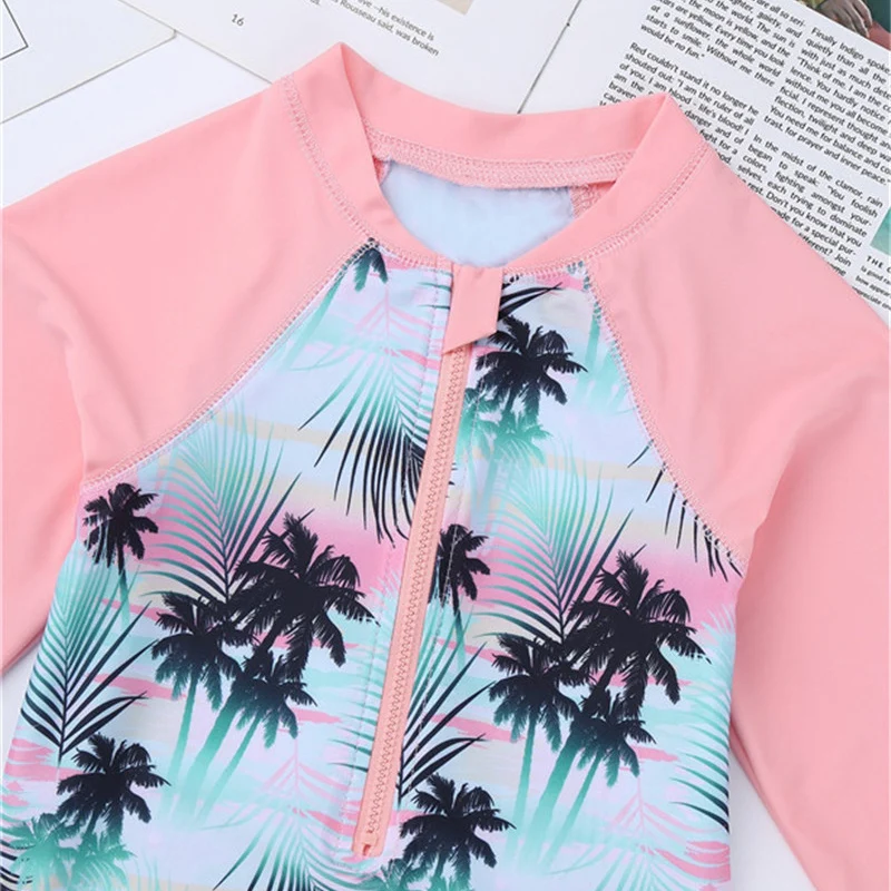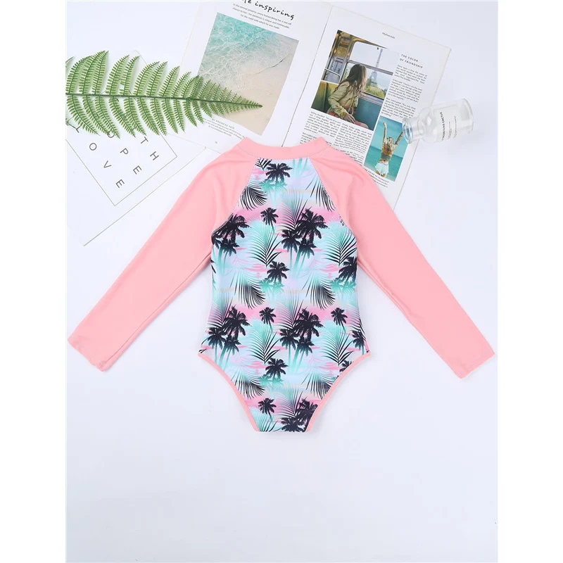 Summer Swimming One-piece Kids Girls Swimsuit Long Sleeves Palm Printed Zippered Bathing Suit Swimwear Rash Guard Beach Wear