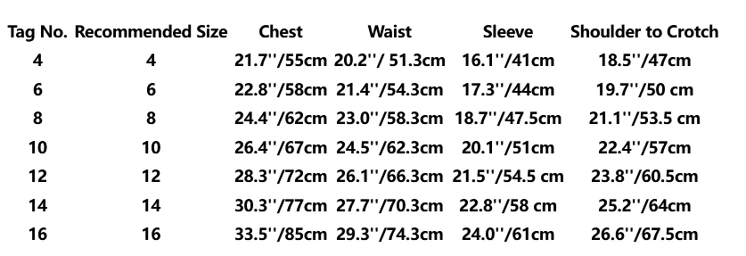 Size Chart:The suggested age and height is just for your reference. If your measurement is floating between two sizes, advise choosing the larger size. (Measurements shown in the size chart refer to item measurements, not body)