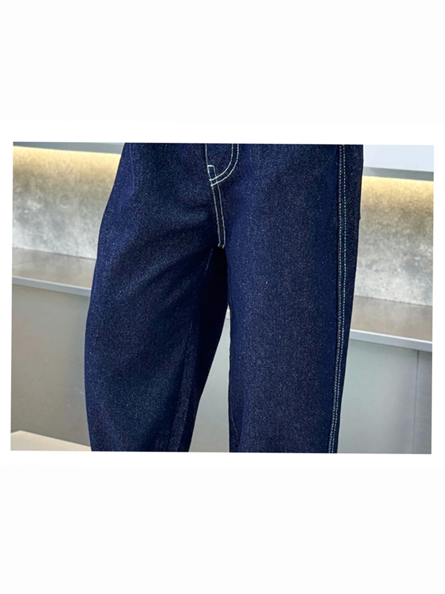 The dark wash denim fabric adds a touch of sophistication while maintaining the casual vibe of the trousers.