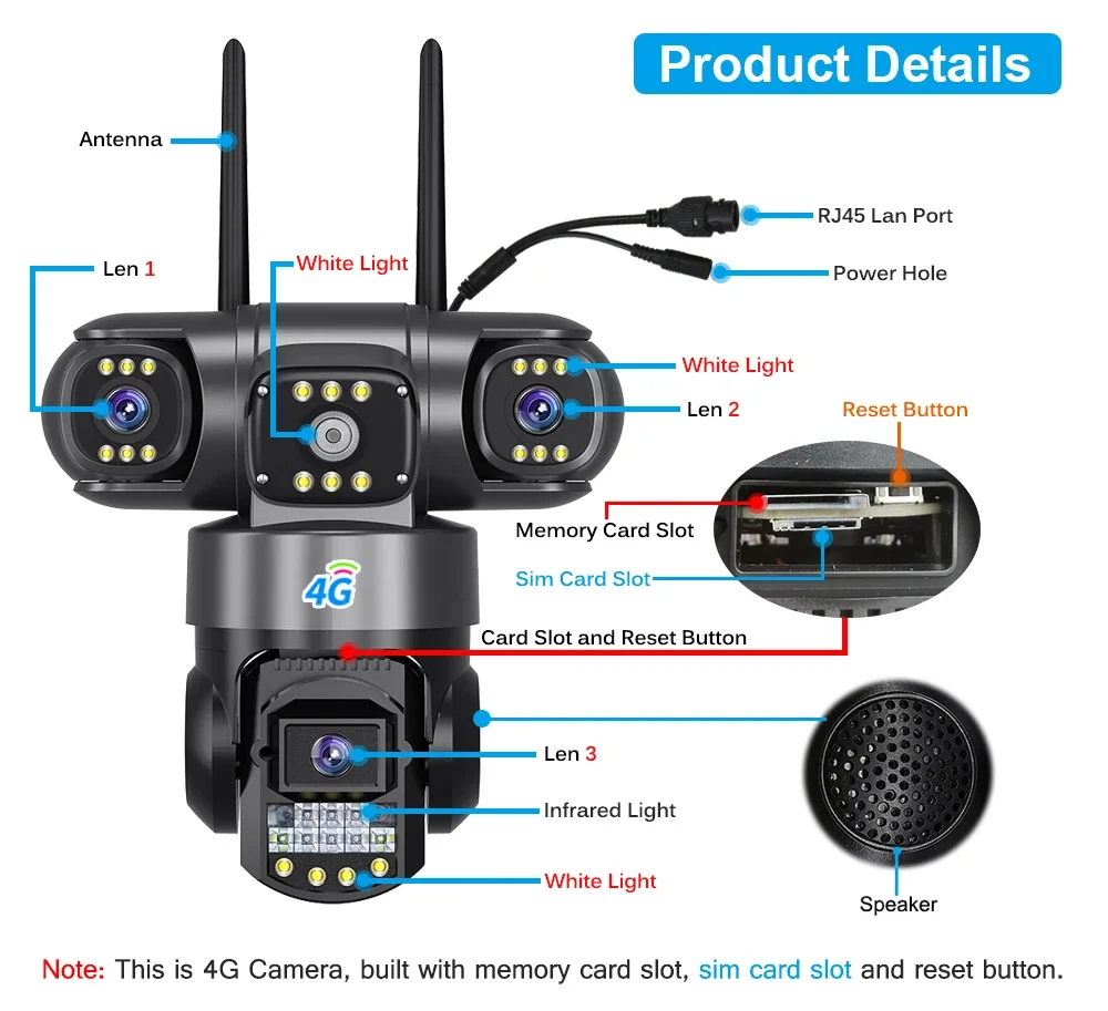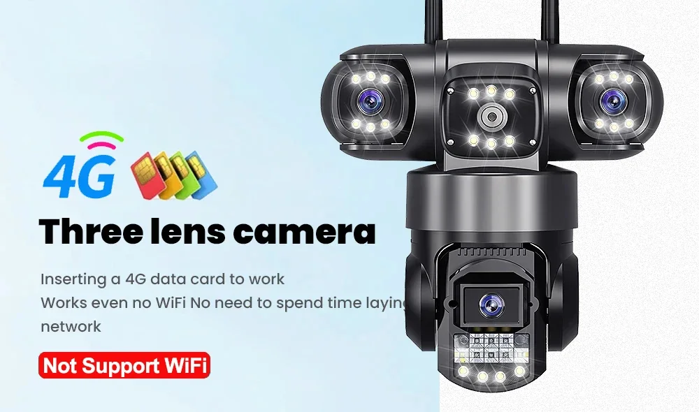 This 4G camera does not work in USA, Japan, pls pay attention.4G Camera With Sim Card 12MP 6K Three Lens Three Screen Monitor Night Vision Security Protection V380 Pro PTZ Video Surveillance